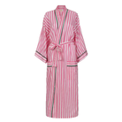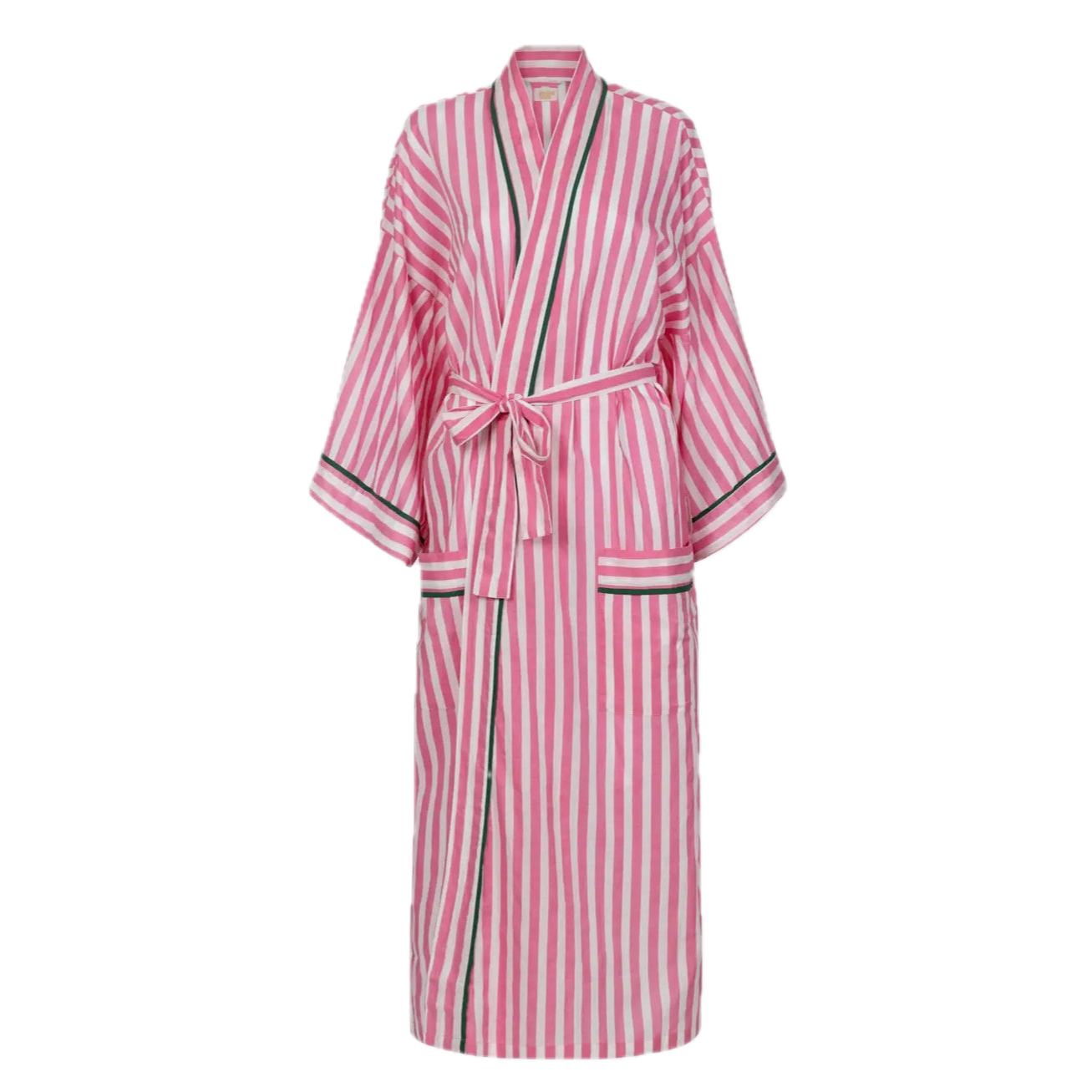 The Tickled Pink Lola robe is a stylish and cozy addition to your loungewear wardrobe. With soft pink and white stripes, accented by green trim, Sunshine Tienda has designed this lightweight and extra roomy robe with a removable belt and wide sleeves for a relaxed fit. Whether lounging at home or in your hotel, it’s the perfect mix of comfort and elegance.