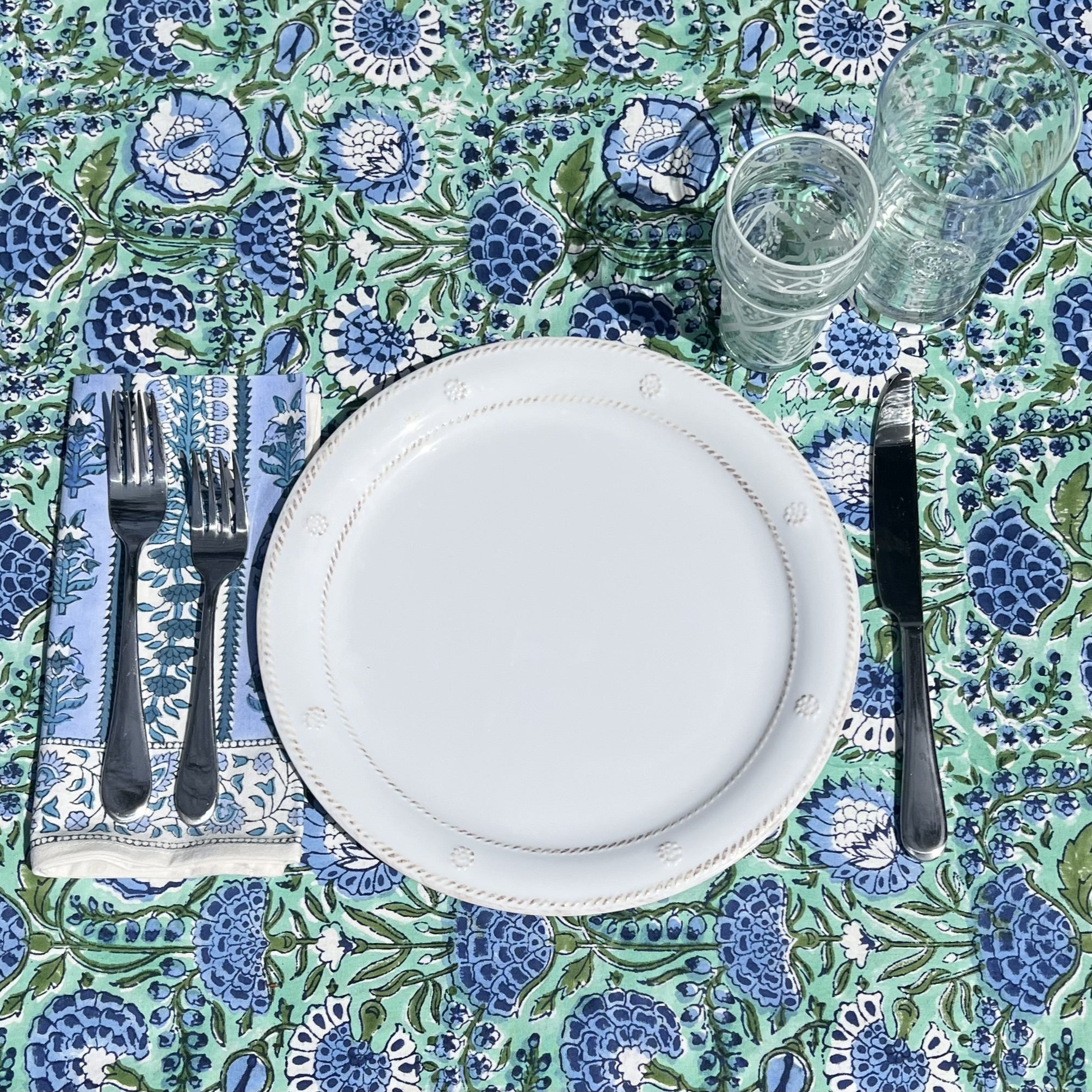 Featuring a botanical design that evokes the sun-kissed splendor of summer, this hand-printed tablecloth is a beautiful base for your tablescape whether you're dining indoors or out. Inspired by the decorative arts of the Mungal Dynasty, each print in the collection is handcrafted by skilled block print artisans who use intricately hand-carved wooden blocks. It is an ancient laborious process, each piece is a work of art distinguished by the work of the artisan, the lot of dye and even the weather conditions. Slight irregularities are inherent and enhance the individuality and uniqueness of each creation.