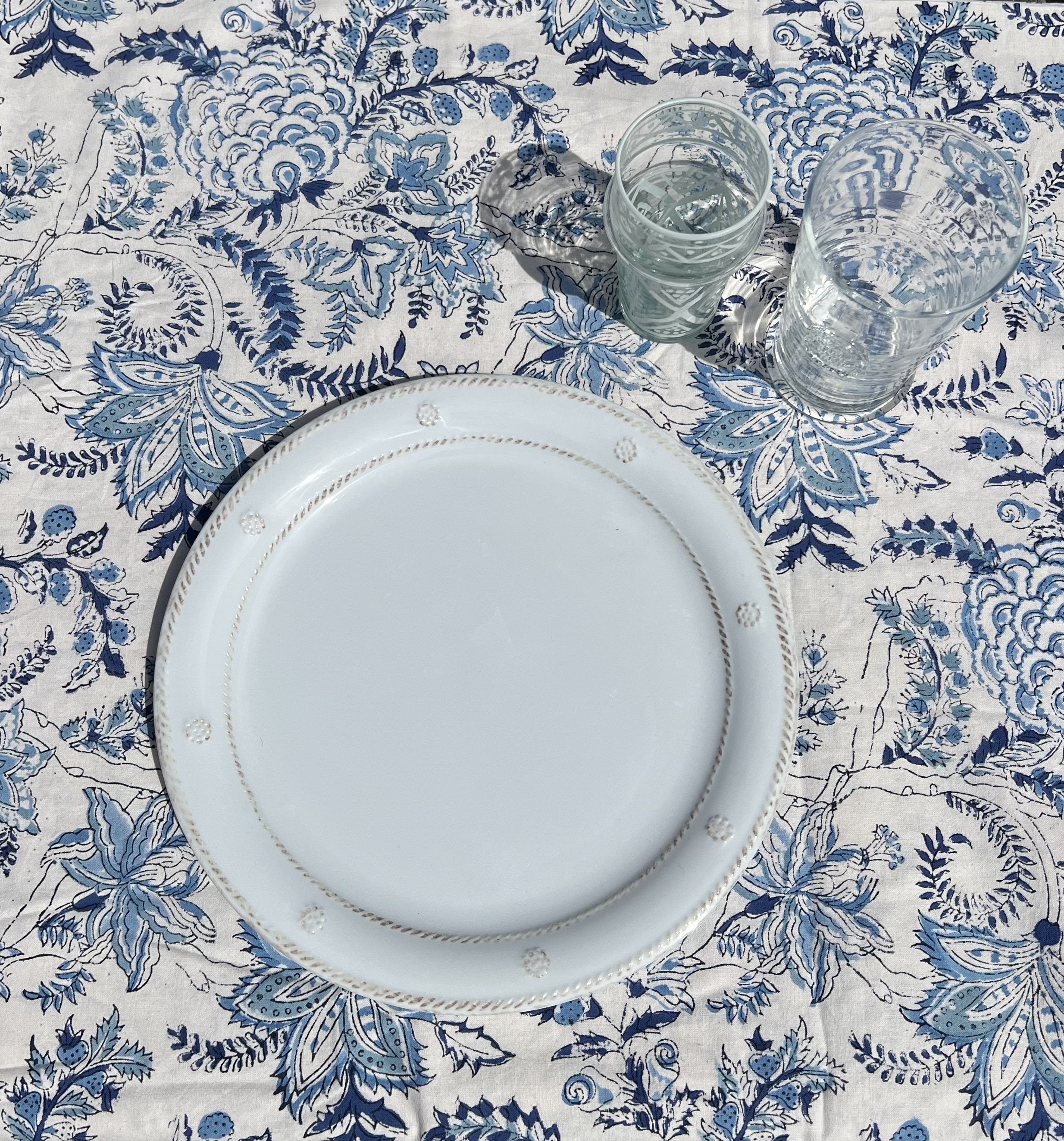 This 100% cotton everyday tablecloth is handprinted with a classic blue and white botanical pattern which is made by skilled artisans using the time-honored technique of block printing. Easy to care for these linens elevate your dining table whether indoors or out.