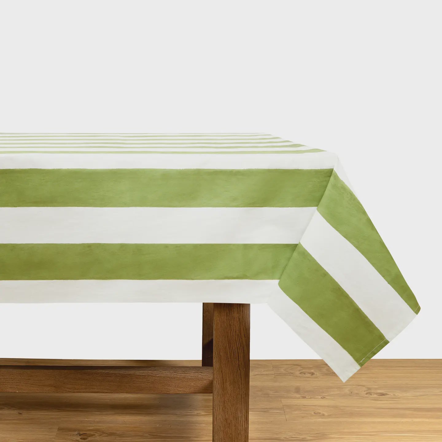 Designed exclusively for Couleur Nature by Parisian artist Bruno Lamy, this tablecloth from Couleur Nature features timeless wide cabana stripes in a soft green. Made from a durable blend of heavyweight linen and cotton, it combines luxury with practicality.