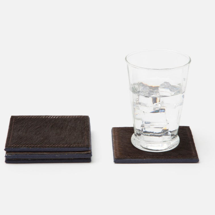 The texture and tailoring of the Tanner hair-on-hide coaster from Blue Pheasant is a luxe detail for your next cocktail party.