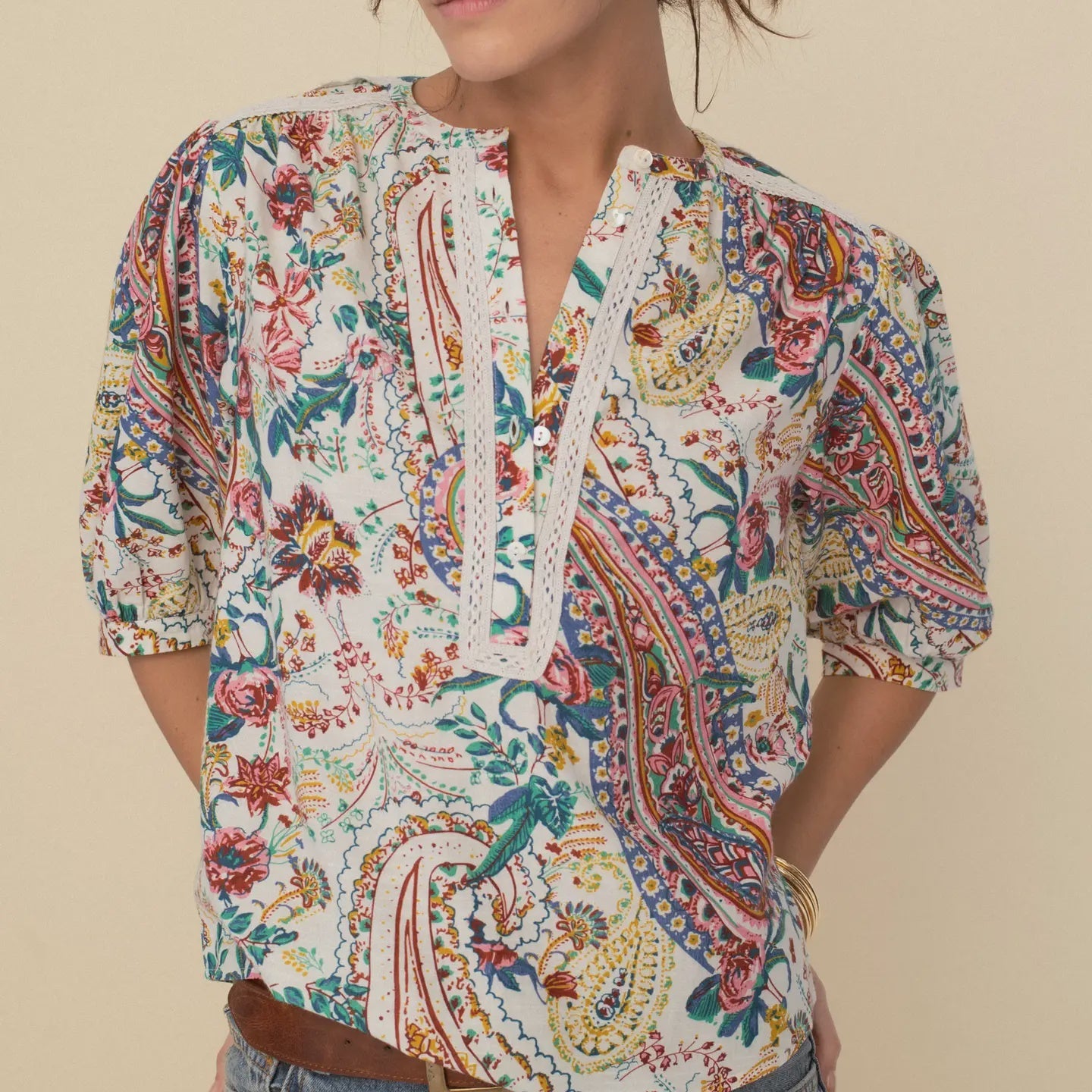 The Luisa blouse combines flowing bohemian shapes with delicate romantic lace. It has a round neckline and a button-front placket layered with lace. The short sleeves fall just below the elbow and feature adjustable button cuffs for a customizable fit.