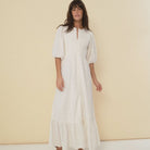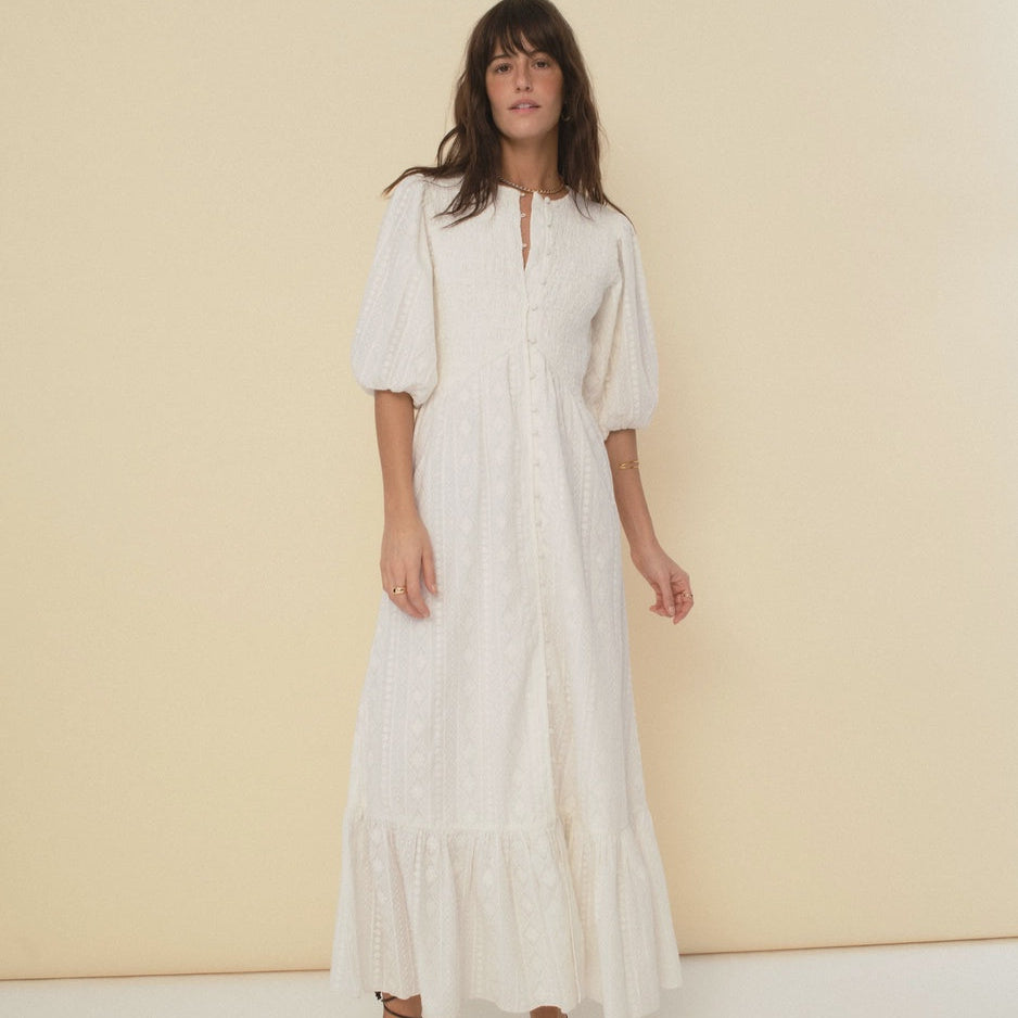 This long dress is made from delicately embroidered organic cotton, echoing the romance of the Edwardian era. It features a round neckline and intricate feminine details, including a stretchy smocked bodice trimmed with delicate crochet. The full-length skirt flows into a wide ruffle hem, adding soft volume and vintage charm.