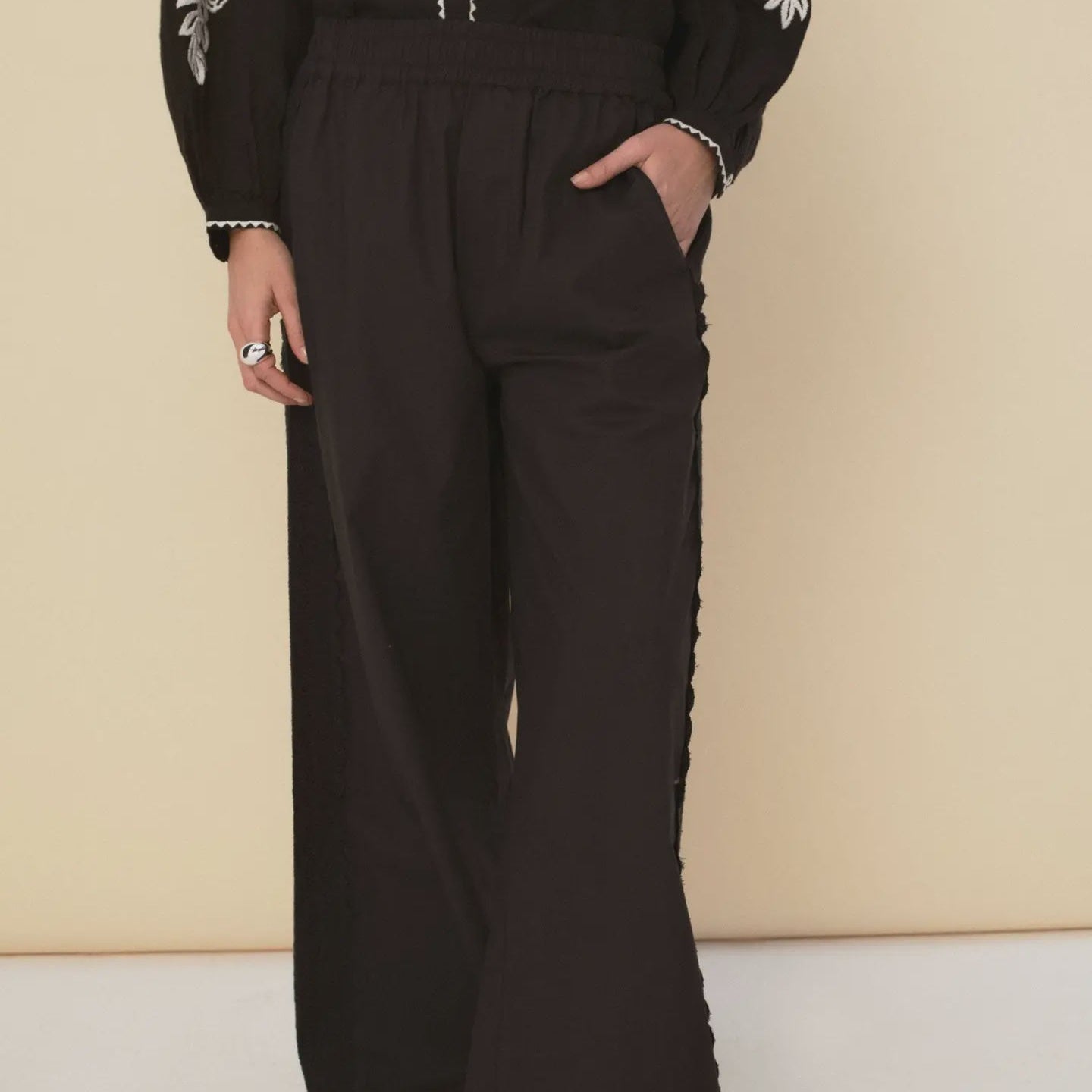 Designed for ease and versatility, this high rise pant features delicate cotton lace detailing running down both sides. It has a relaxed fit and an elastic waistband for effortless comfort and movement. Whether styled with the Helen dress for a coordinated look or worn on its own, it is perfect for day events or polished office wear.