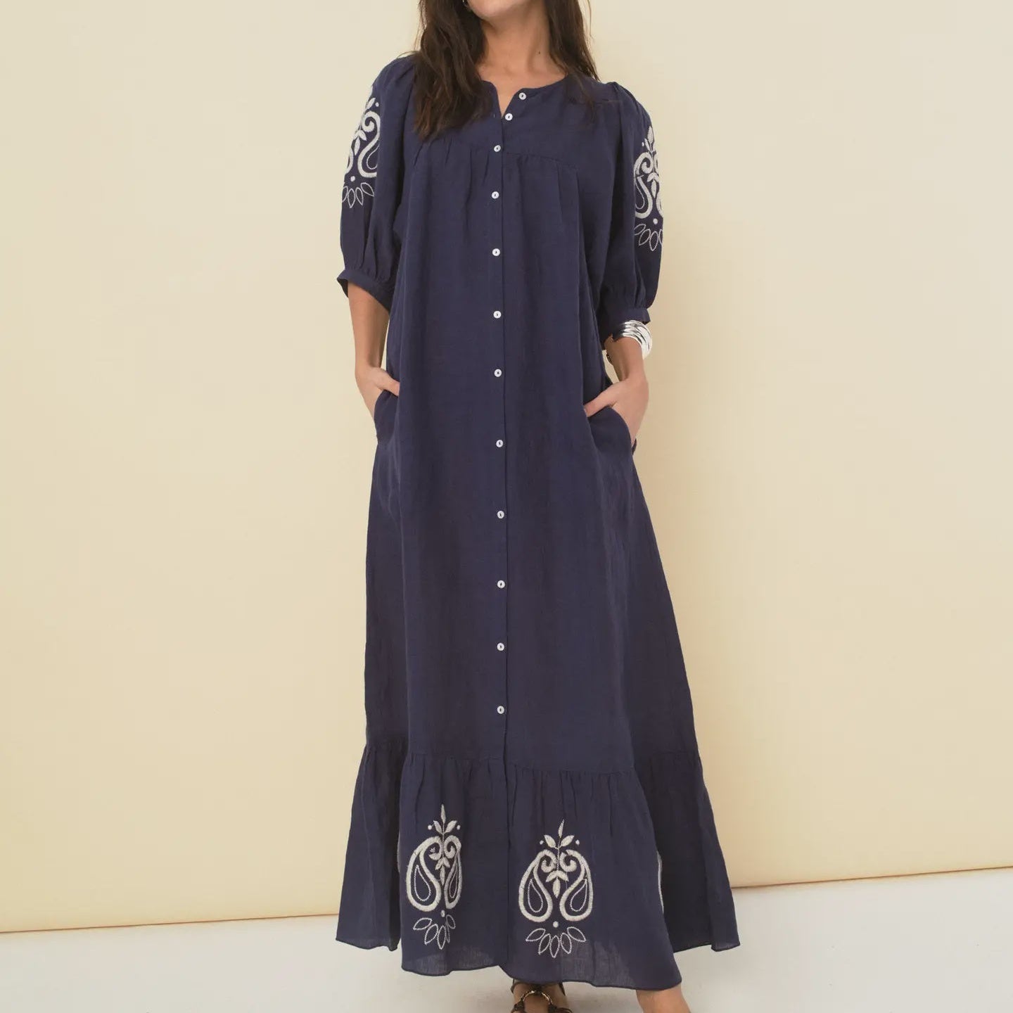 The Sofia dress is crafted in a quality linen and designed with an easy, flattering silhouette. It features short sleeves that fall just below the elbow, a full button front closure, and a long, flowing ruffle hem finished with detailed embroidery. Light and breathable, it is the perfect dress for warm days and relaxed occasions.