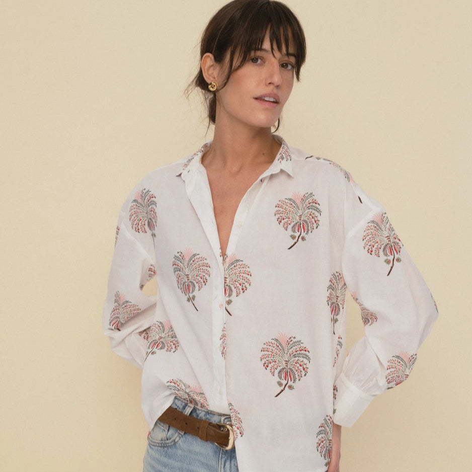 Tailored in a soft, lightweight cotton voile, this oversized button-down blouse with stand collar and loose fit, has full-length sleeves and mother-of-pearl buttons. Wear it loose or tuck it into a skirt or jeans.