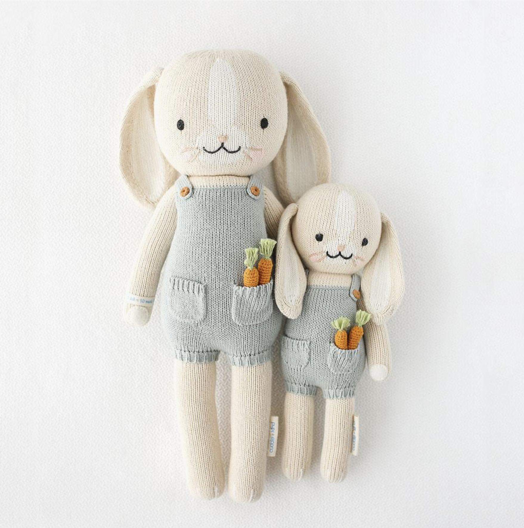 Special details on Henry the Bunny's overalls include an adorable pocket stuffed with carrots and stitched buttons. Hand-knit with 100% cotton yarn, this 20-inch friend is safe for babies, makes a great shower or new baby gift, and gives back to boot. Every cuddle+kind doll provides 10 meals to children in need and empowers artisans in Peru with fair trade income.