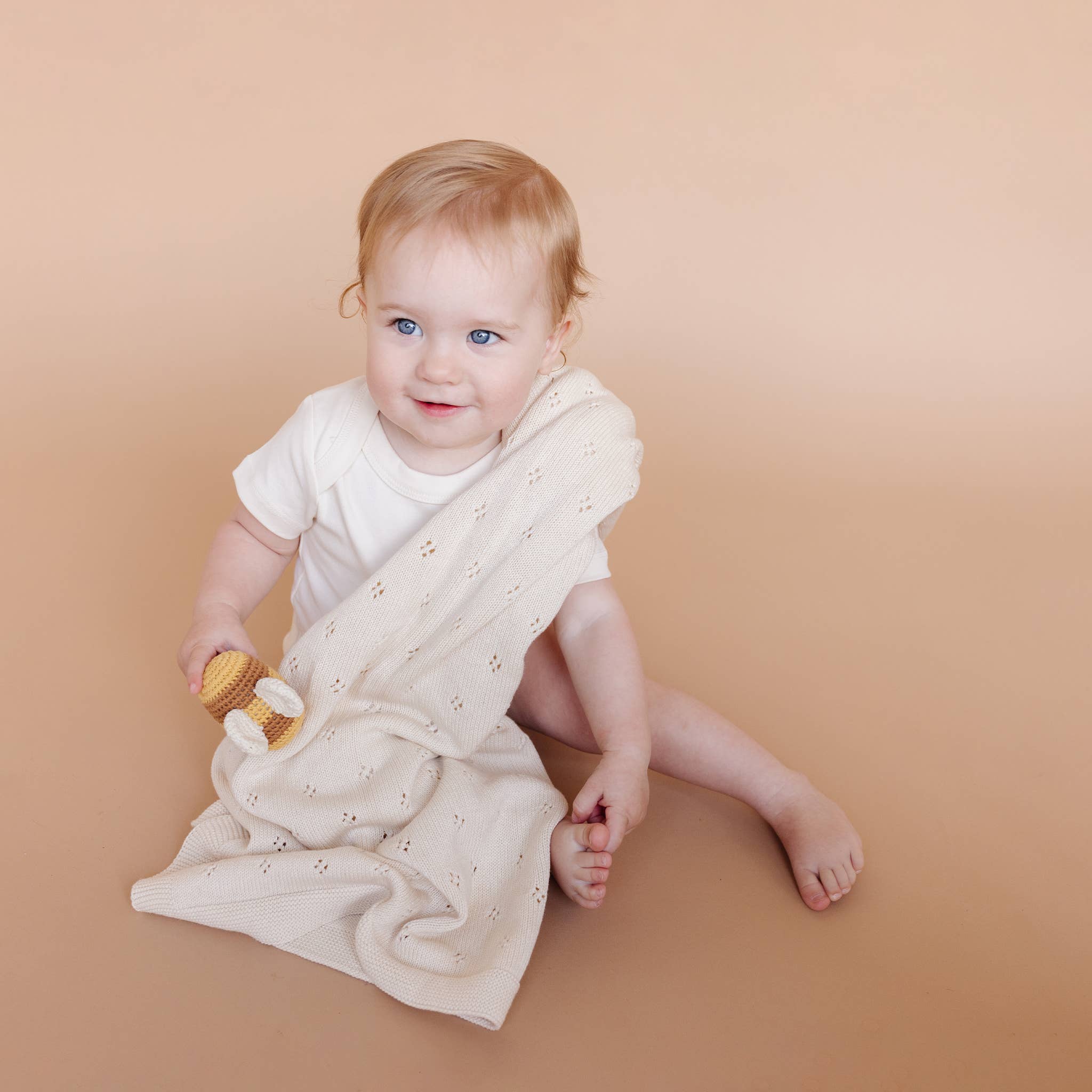 Featuring our playful Harper Bear, this cuddly lovey and blanket set is the perfect newborn gift. Crafted in super soft organic cotton.
