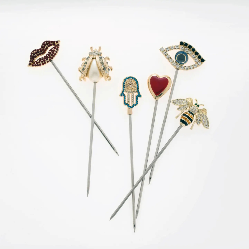 We cannot get enough of these charming cocktail picks with some of our favorite icons. You'll never mix up your cocktails with an evil eye, bee, red lips, ladybug, heart, and hamsa to keep them distinguishable. This set of six is food-grade stainless steel.