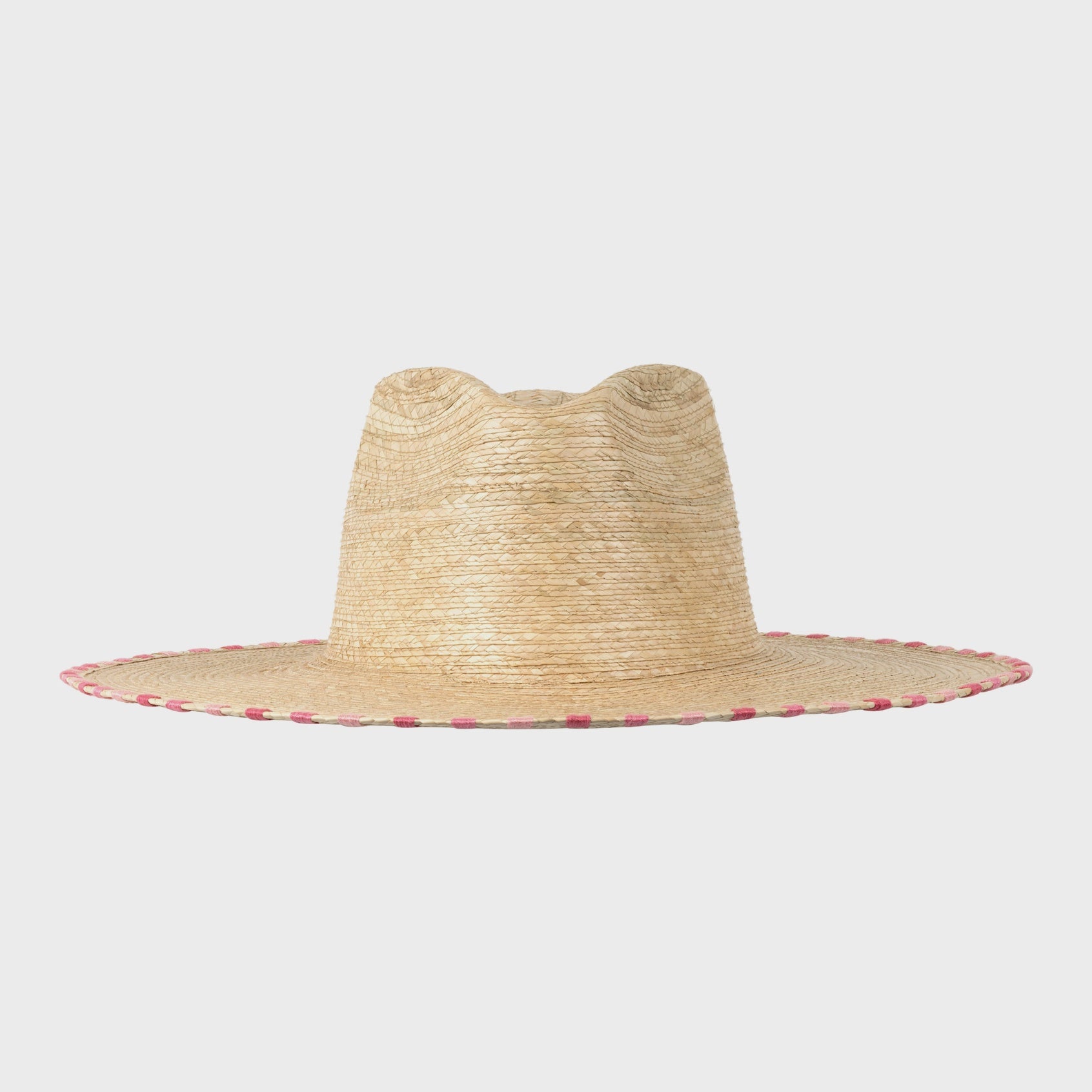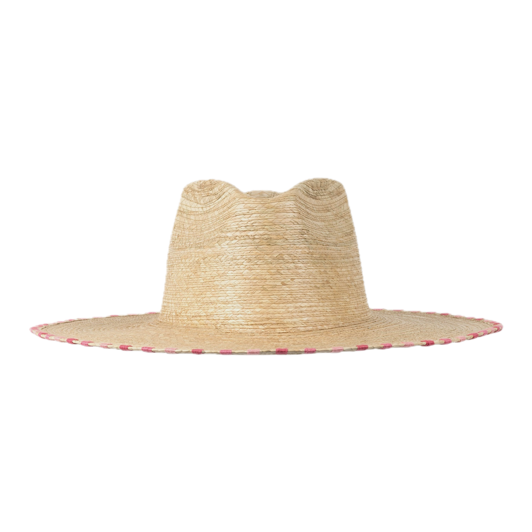 The Adelina Palm Hat comes without the band and features hand-stitched pink stripes along the brim. It is part of Sunshine Tienda's sustainable, fair trade hat collection and graded at the highest UPF rating. The colors of the crown of the hat are shades of pink.