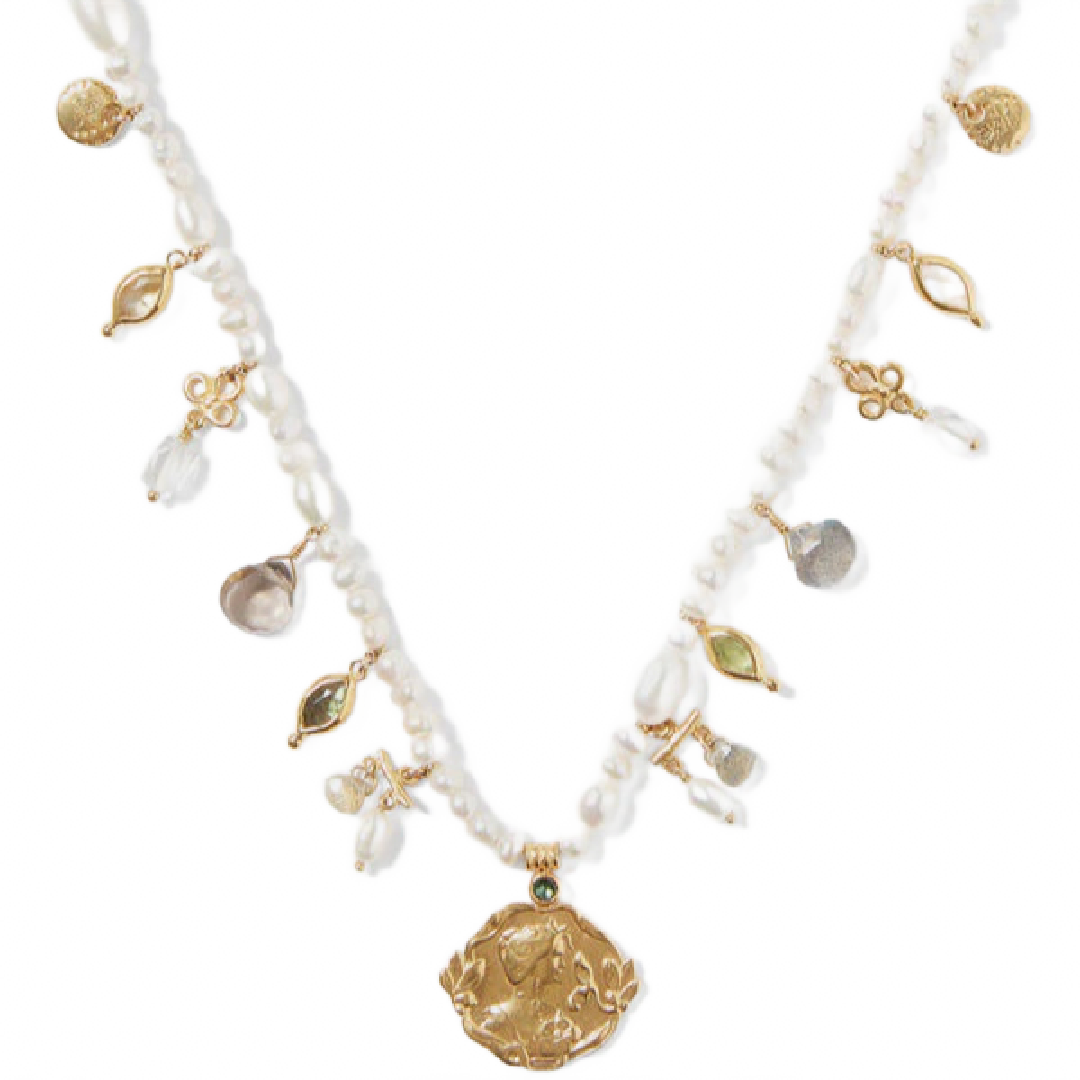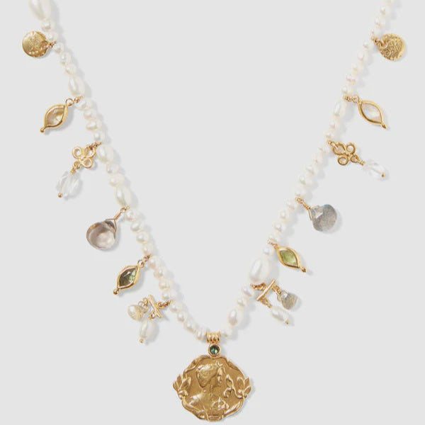 A necklace of luminous white pearls is enhanced by gemstone and pearl charms with an exquisite gold portrait coin pendant.
