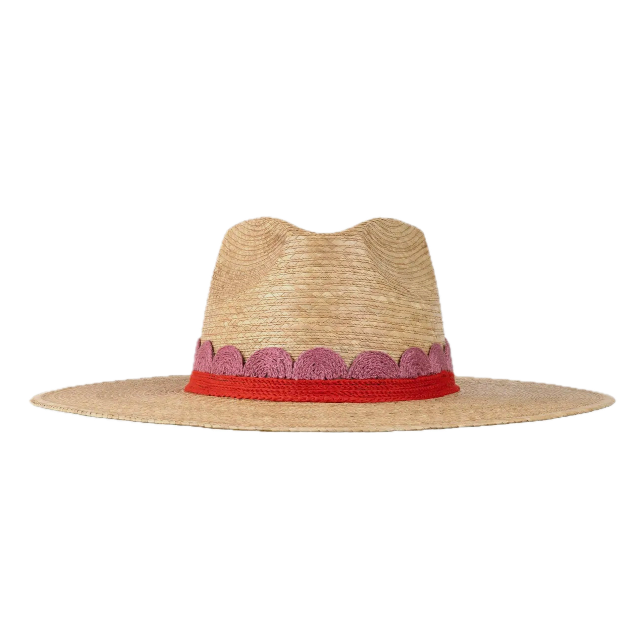 Sunshine Tienda's scalloped palm hat features a red and pink color-block cotton band with hand embroidered scalloped detail. It's part of the brand's sustainable, fair trade hat collection and rated UPF 50+, the highest possible UV protection. Due to the complexity of a hat made by hand, each hat slightly varies within a size.