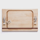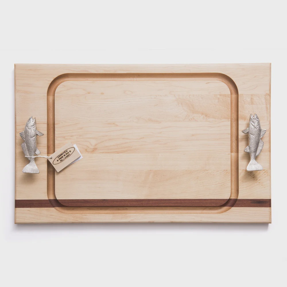 This maple steak board is well-suited for the fishing enthusiast but its deep juice groove makes it a beautiful display for anyone serving steak, salmon or chicken. The chrome-plated brass handles make it easy to move whatever you're serving from prep counter to table and back again.