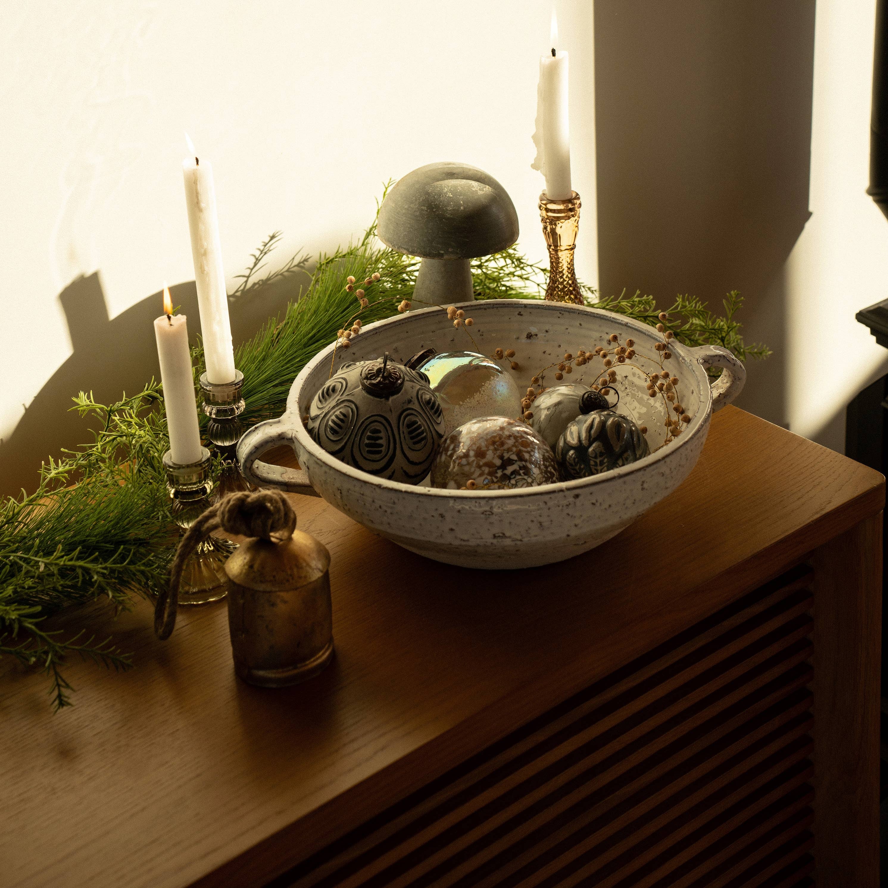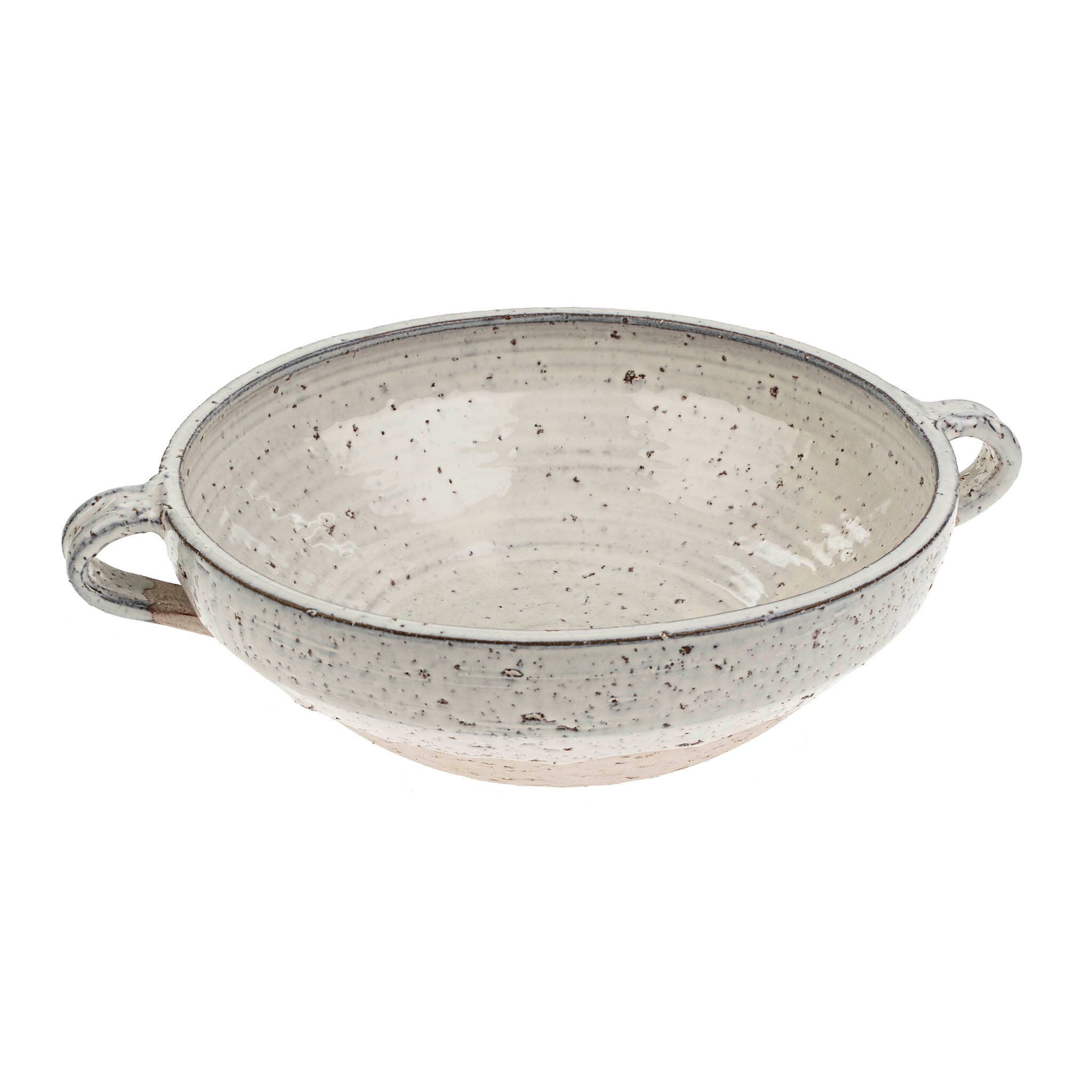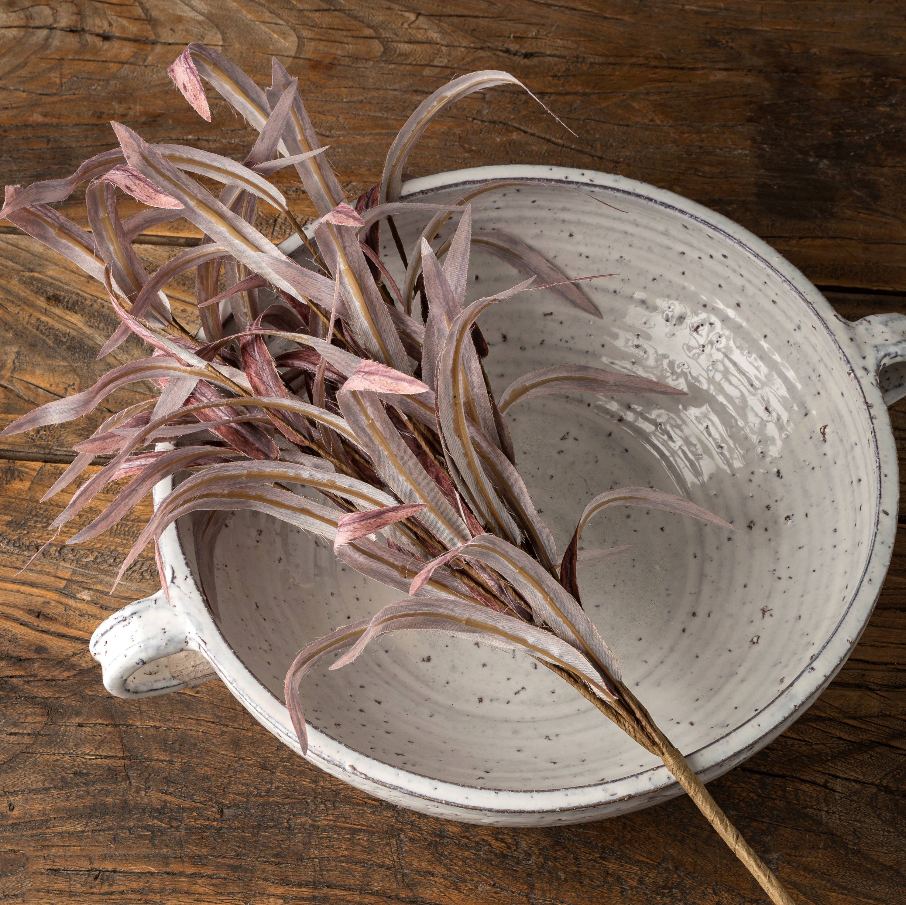 The Annecy terracotta bowl from Indaba Trading embodies wabi-sabi beauty with a farmhouse aesthetic, featuring an interplay of warm and cool-toned matte and glossy glazes. Impressively grand in scale, its speckled finish adds stunning visual appeal to kitchen islands or dining tables.