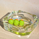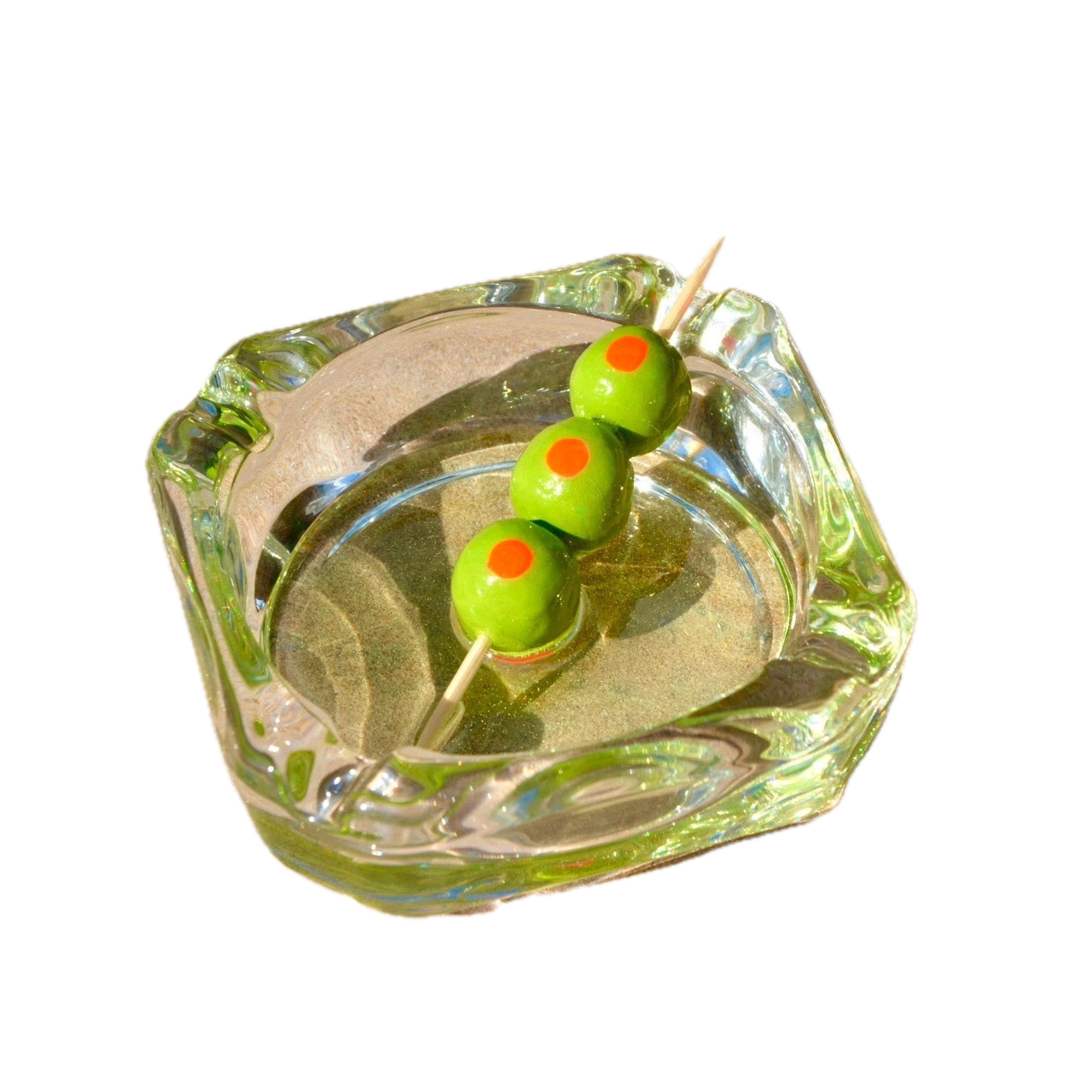 For those who prefer their martini extra dry, art imitates life with this ash tray sculpture. It can function for regular use or provide an amusing conversation starter. An acrylic "olive brine" and ceramic olives replicate all the makings of your favorite martini. Expect variations in color as each piece is handmade.