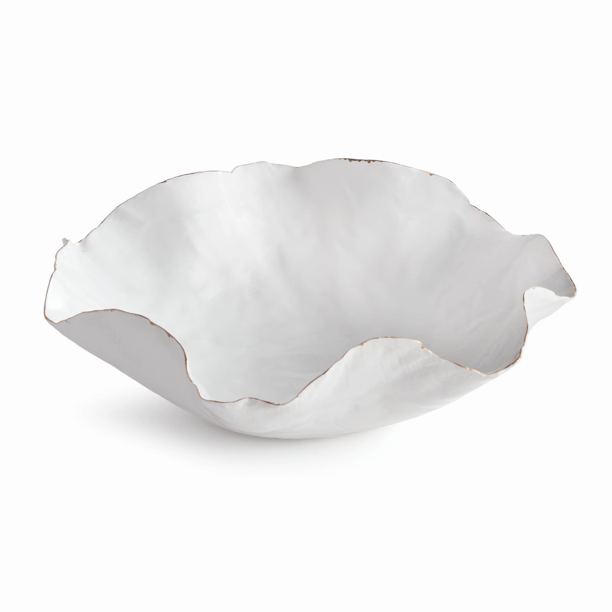 With crimped edges and natural form, thee Maribella decorative large tray has hand-brushed gold-tipped edges that have been electroplated for shine and durability. The shimmery bone-colored tray makes a beautiful piece atop an entryway table, bookshelf or tabletop.