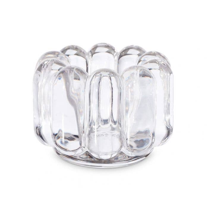 Tom Dixon's Press is a vertical tealight holder, designed and engineered to catch and refract light, and to last for ever. This heavyweight grooved candleholder is made of fat, chunky coils of pure and clear transparent glass. Bold in silhouette and simple in function, it is manufactured by dropping big globs of molten glass at 1,200º centigrade and pressed in two- or three-part iron molds to create the immediately familiar silhouette.
