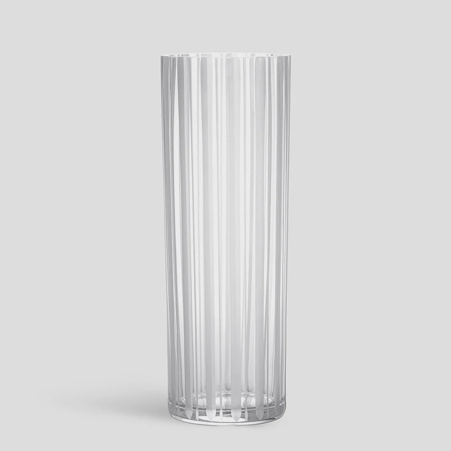 The tall cylinder vase with a stripe motif in the Cut In Number collection from Orrefors is ideal for long stem flowers. The satin finished cuts on the vase beautifully emphasize the transparency of the clear crystal. It is designed by Ingegerd Råman.