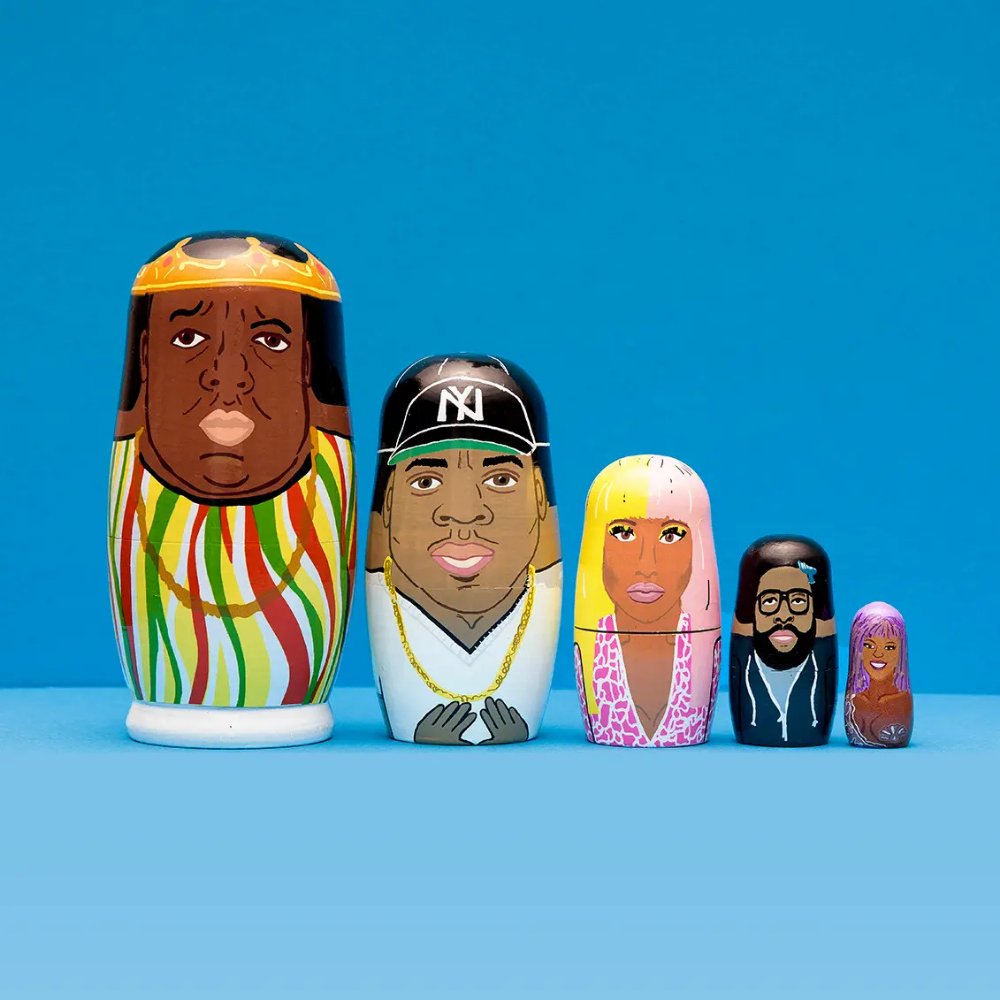 Settle the East Coast/West Coast debate once and for all. These stars are notorious for their dexterity—lyrically. And you know what? They better be. The Best Coast accolade doesn't come easily. Set of 5 wooden nesting dolls that fit into one another. Each box opens up to reveal a star-studded dressing room.