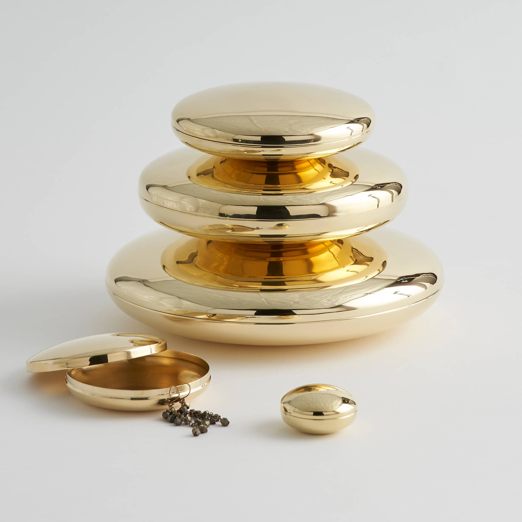 These flat round boxes are suited to necklaces, notes, desk supplies and secret stashes. Boxes feature tight, press-fitting lids, and each nesting set ships tucked in its own drawstring gift bag. Boxes are for decorative use only. Brass may develop a patina over time. To clean, buff with a soft cloth. To polish, use a polishing compound specific to brass and refer to manufacturer’s instructions. Boxes are for decorative use only.