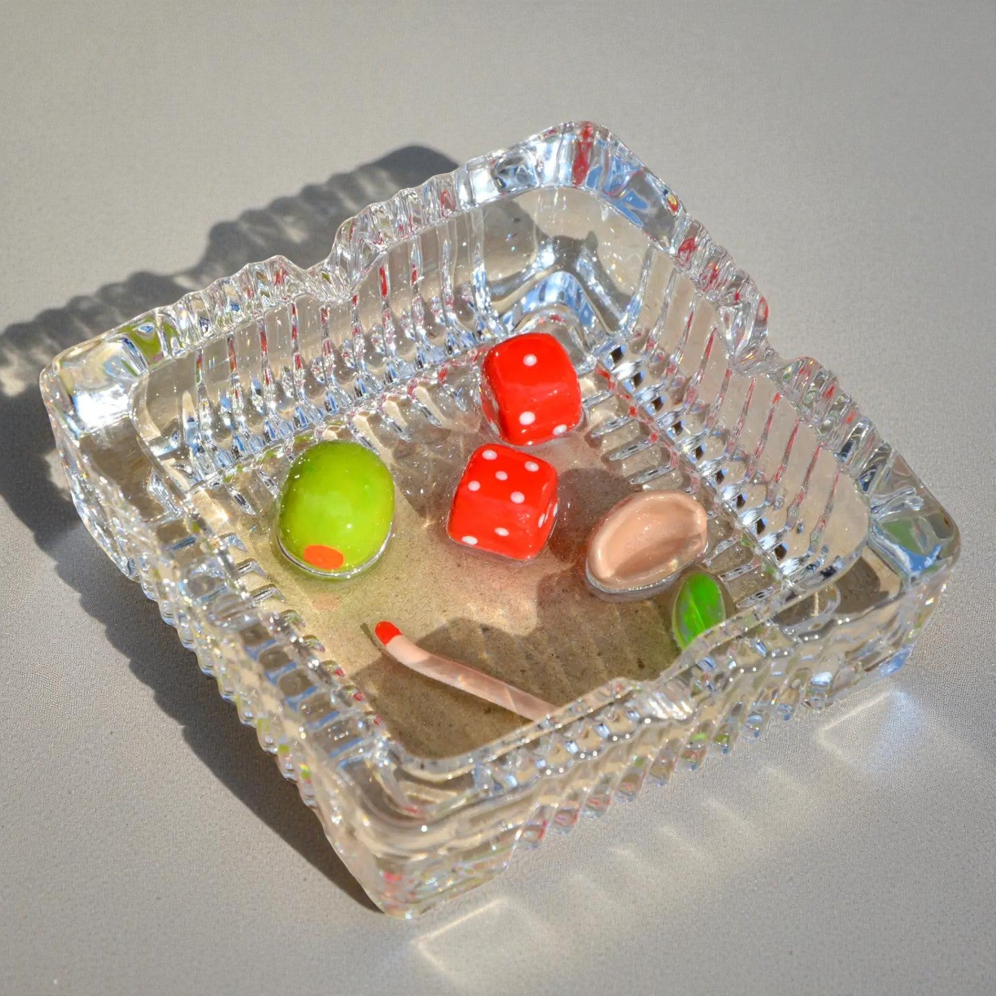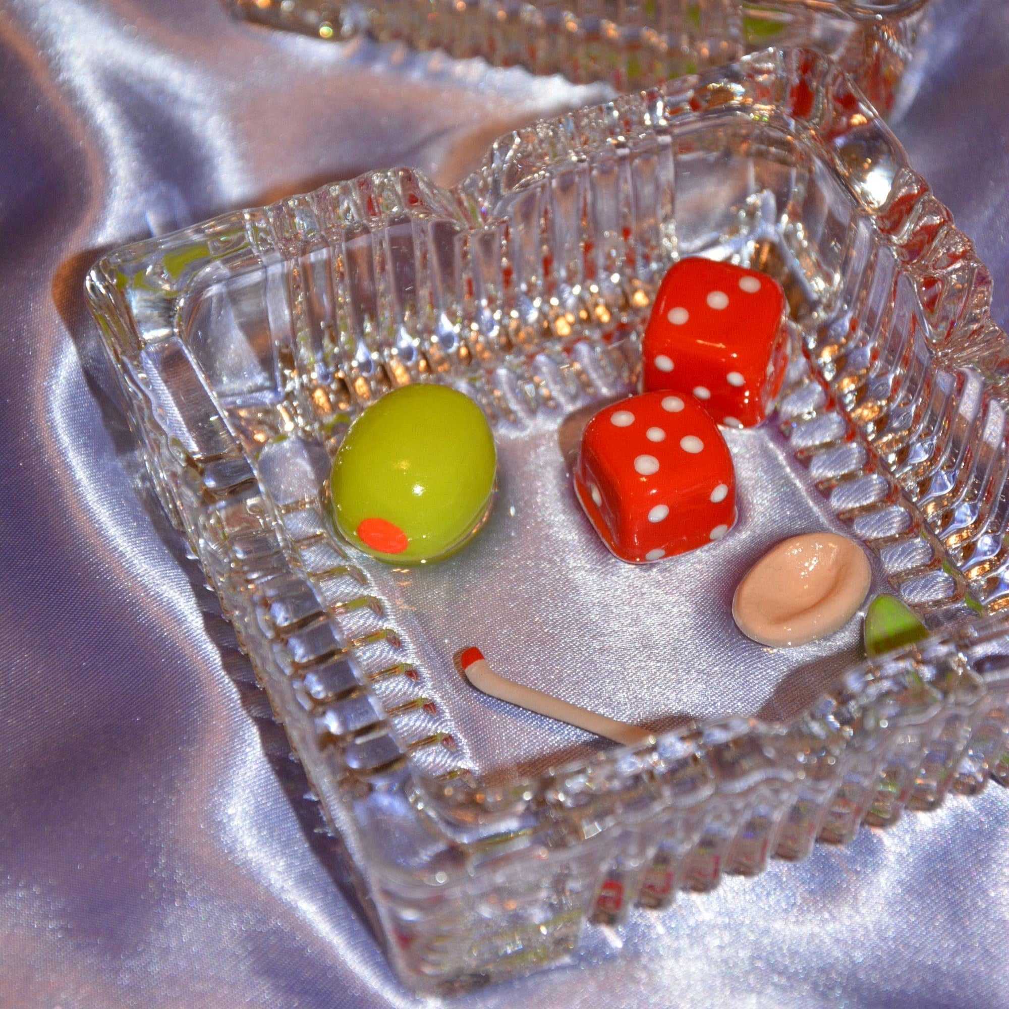 This object d'art doubles as a real ashtray if you need it to, and features a ceramic olive, red dice, a cracked pistachio and a burnt matchstick.