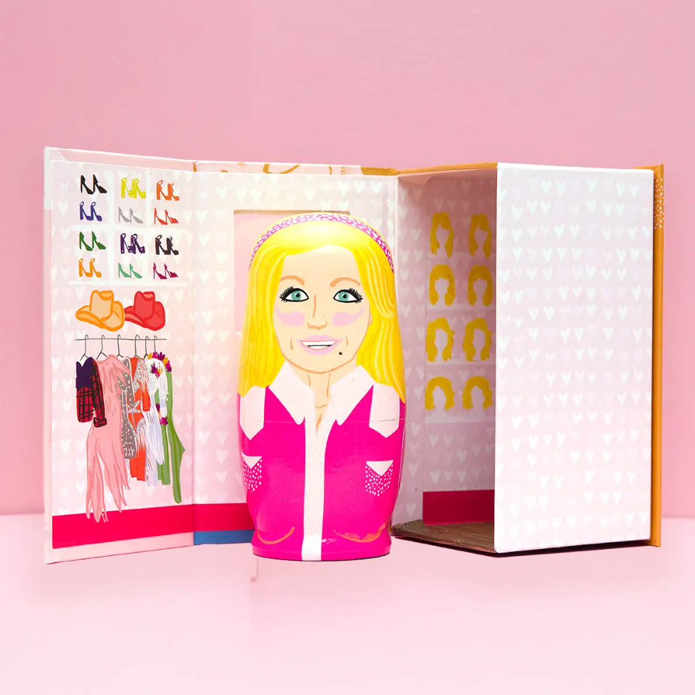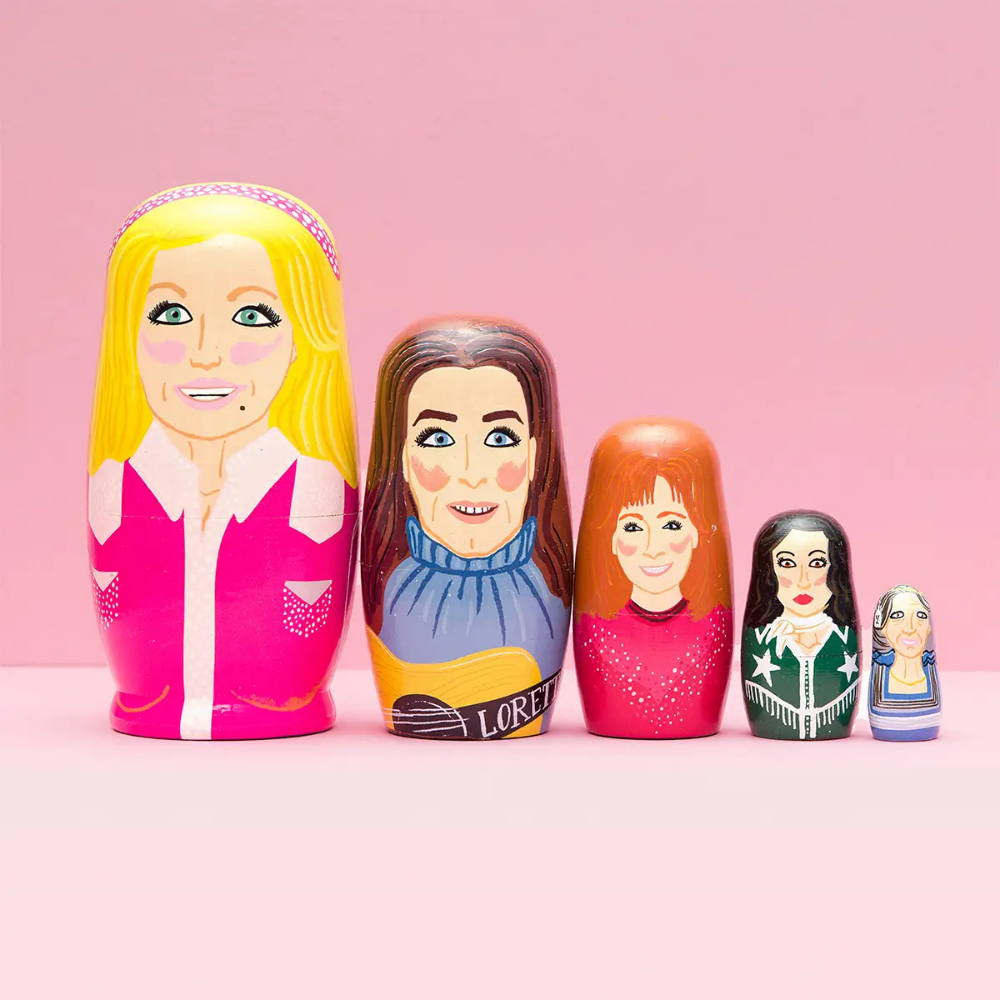 These women are stacking' together and stickin' it to the partiarchy. Enjoy the dulcet tones of these famous females and turn your living room into the Ryman mainstage. These women are all about busting through glass ceilings, and breaking out of their (wooden) shells. And remember, your favorite singer could be Two Dolls Down. Set of 5 wooden nesting dolls that fit into one another. Each box opens up to reveal a star-studded dressing room.