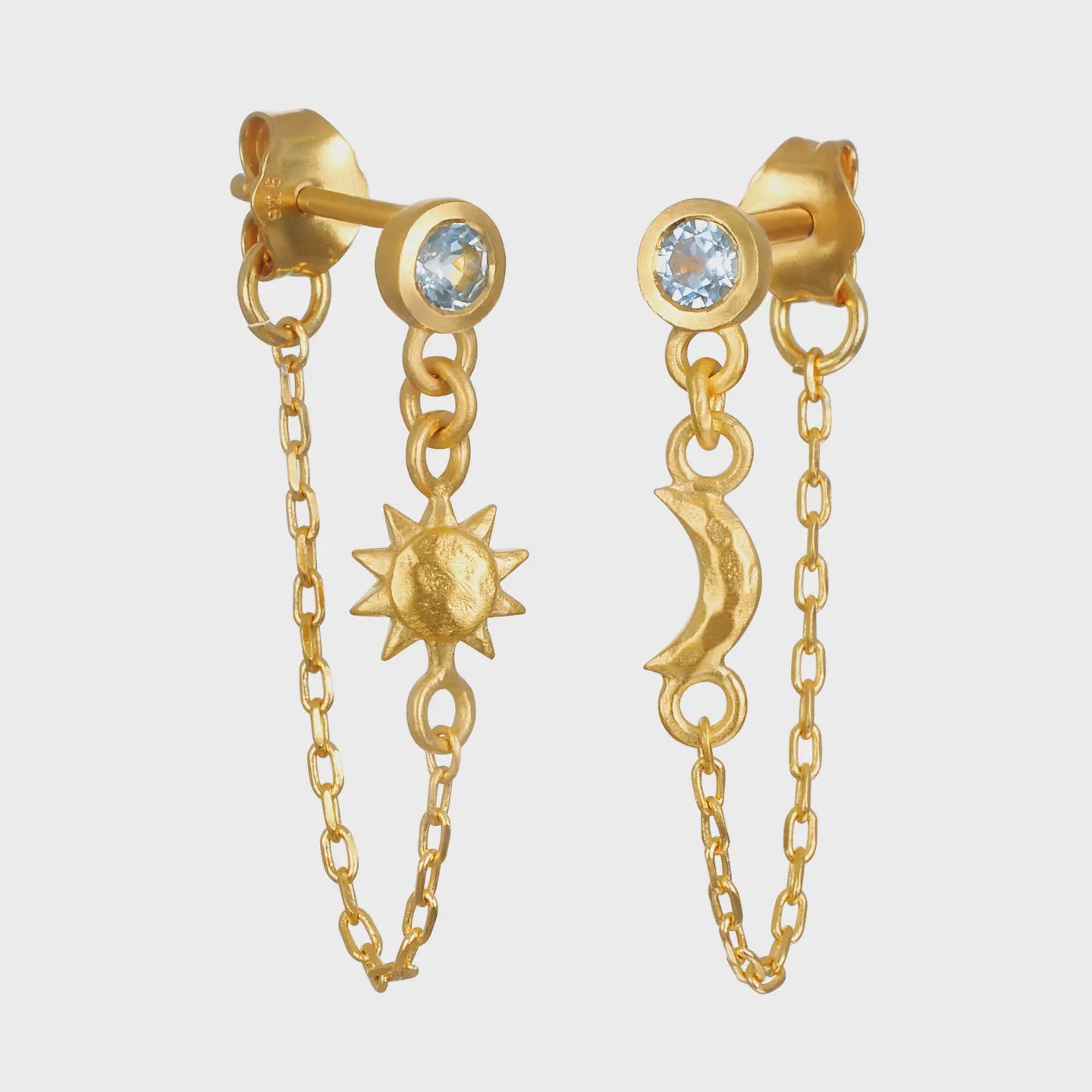 Blue topaz, a symbol of communication, wisdom and love, is anchored to a gleaming sun and moon by a delicate gold chain for an earring that catches the eye and stirs the imagination. The cresent moon has long been a symbol of new beginnings while the sun symbolizes vitality, leadership and life. This dangling pair of earrings reminds us to be light and wisdom for those around us.