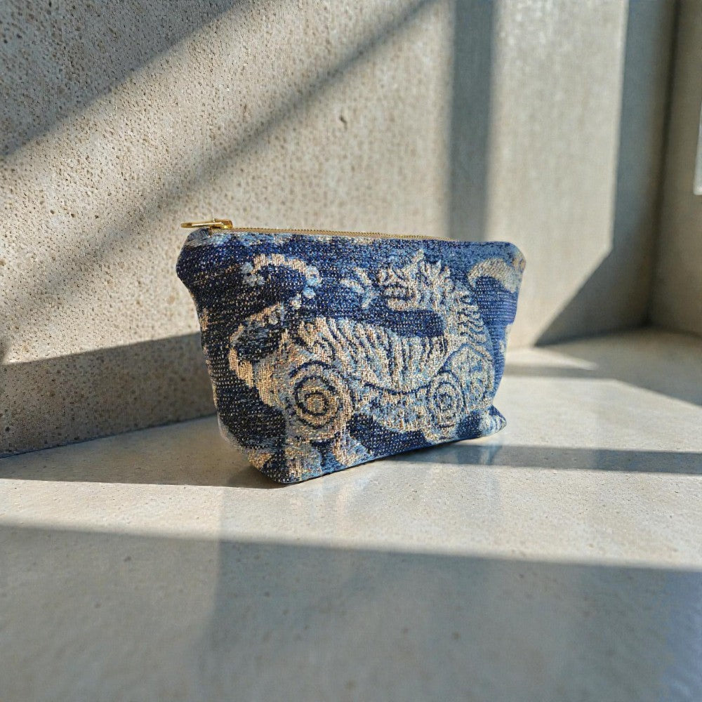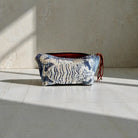 The Tiger traveller pouch combines elegant blue cream and grey hues with a plush velvet lining. Designed with durability in mind, it features a heavy-duty zipper for secure closure. It's ideal for everyday use or travel.