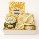 A savory spread that is ready to serve. This elegant set features fresh pesto, artichoke lemon pesto, olive oil crackers, and a chic resin tray with bowls and spoons, perfect for effortless entertaining.