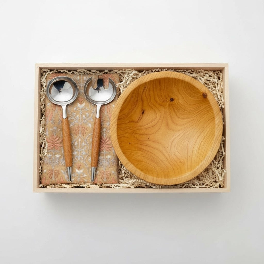 The Thoughtful Table is a New England inspired collection designed for effortless, everyday hosting. Featuring a classic cherry wood bowl, sculptural salad servers, and a charming block print tea towel, this set brings warmth, function, and timeless style to any table. A beautiful gift for hosts, newlyweds, or anyone who loves to gather and share.