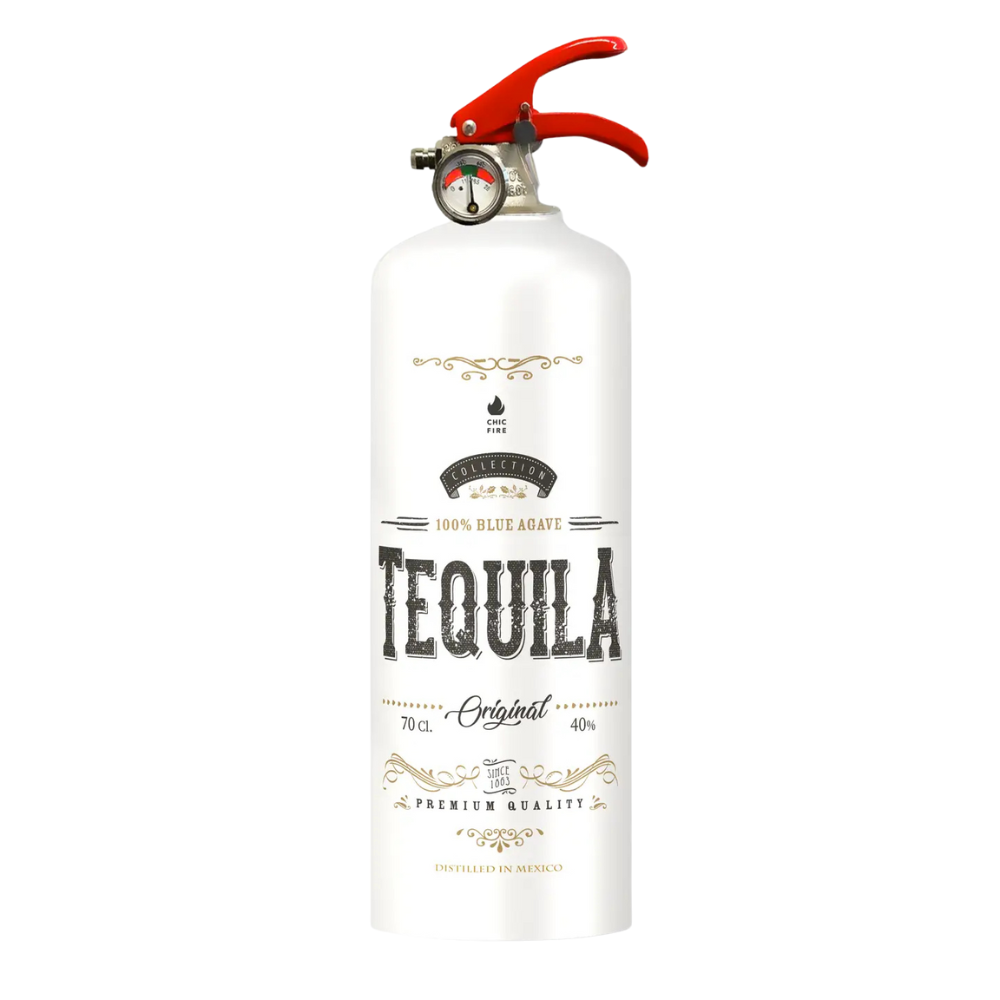 A fire extinguisher designed to resemble a wine bottle, with a black body, a red valve, and labeled 'MORIENSART'.