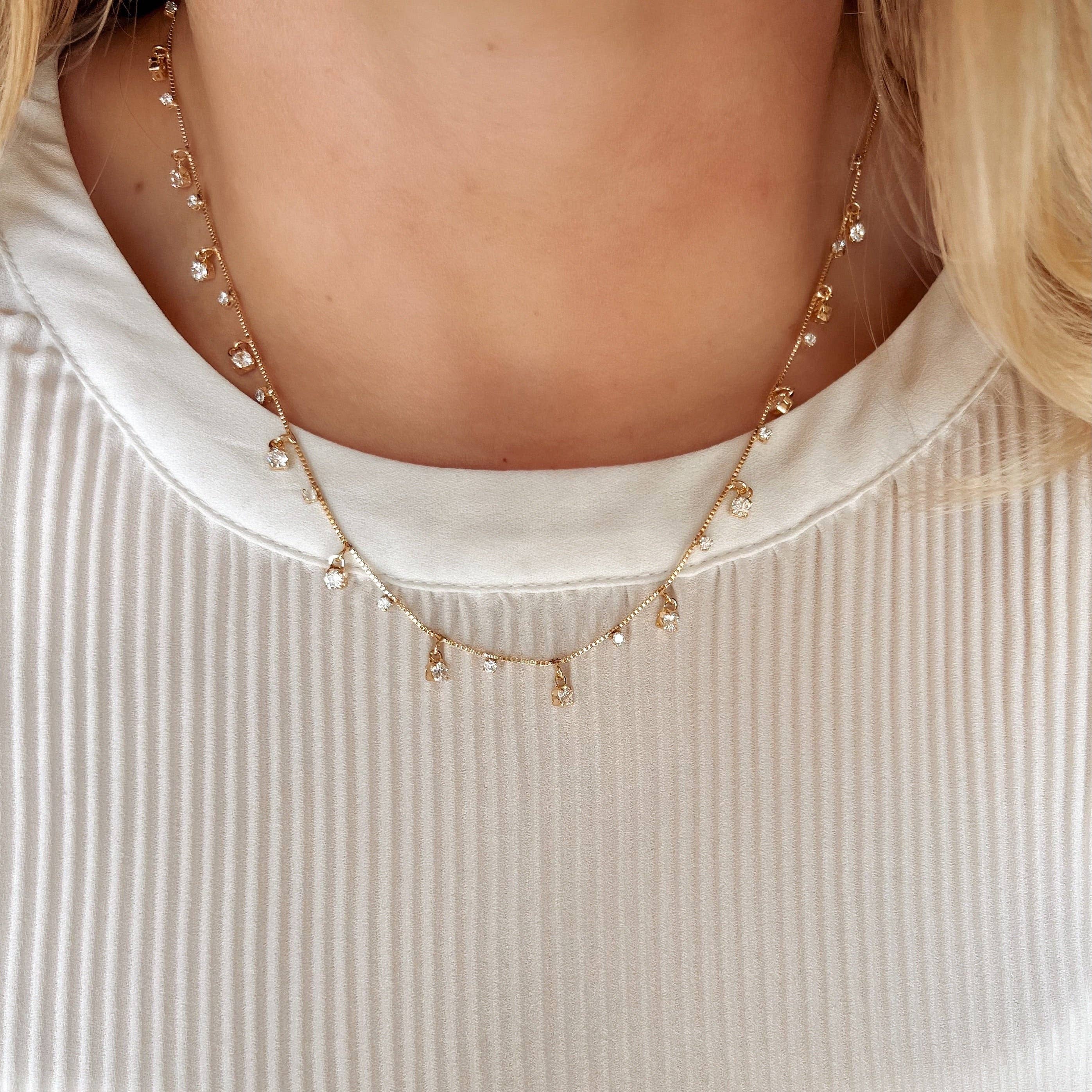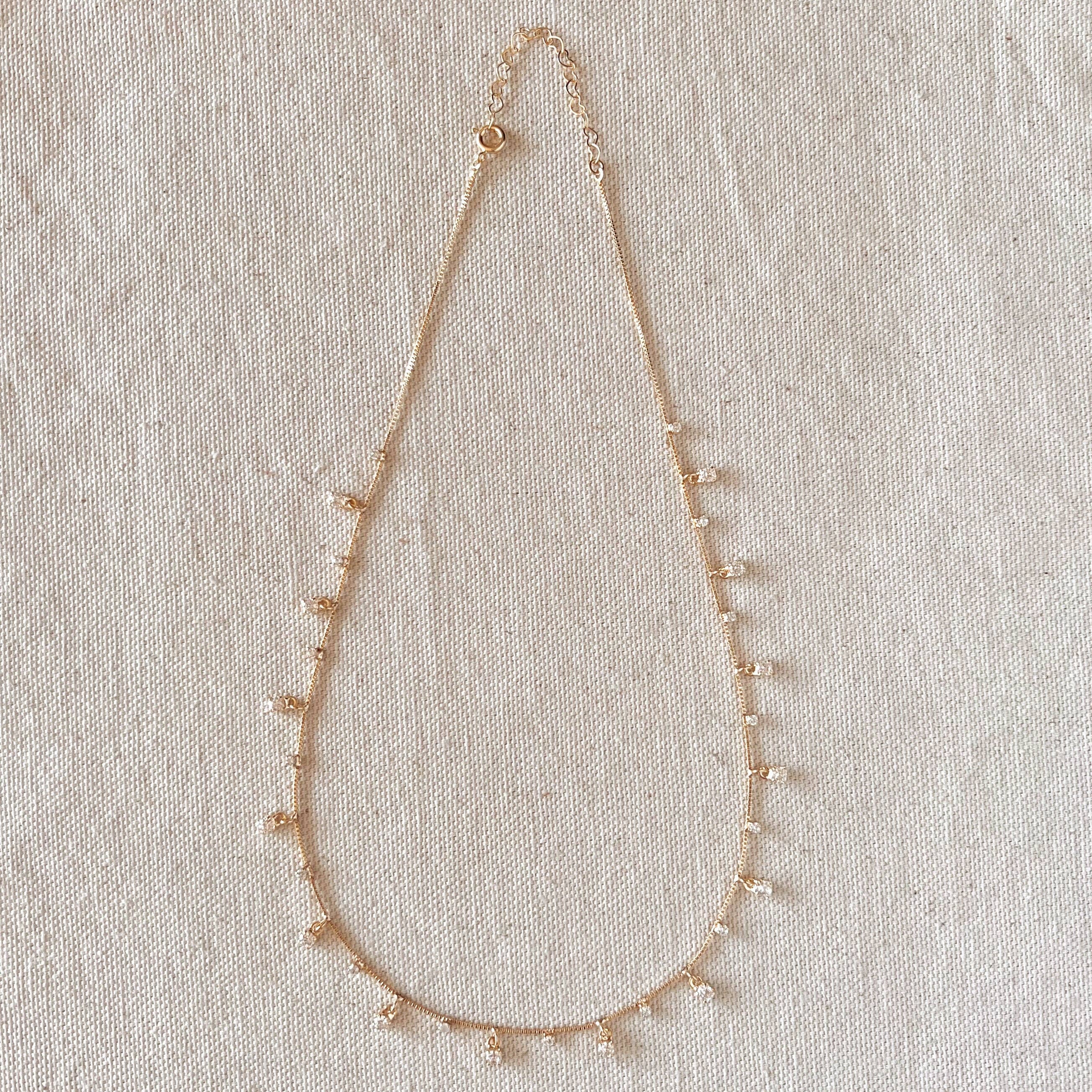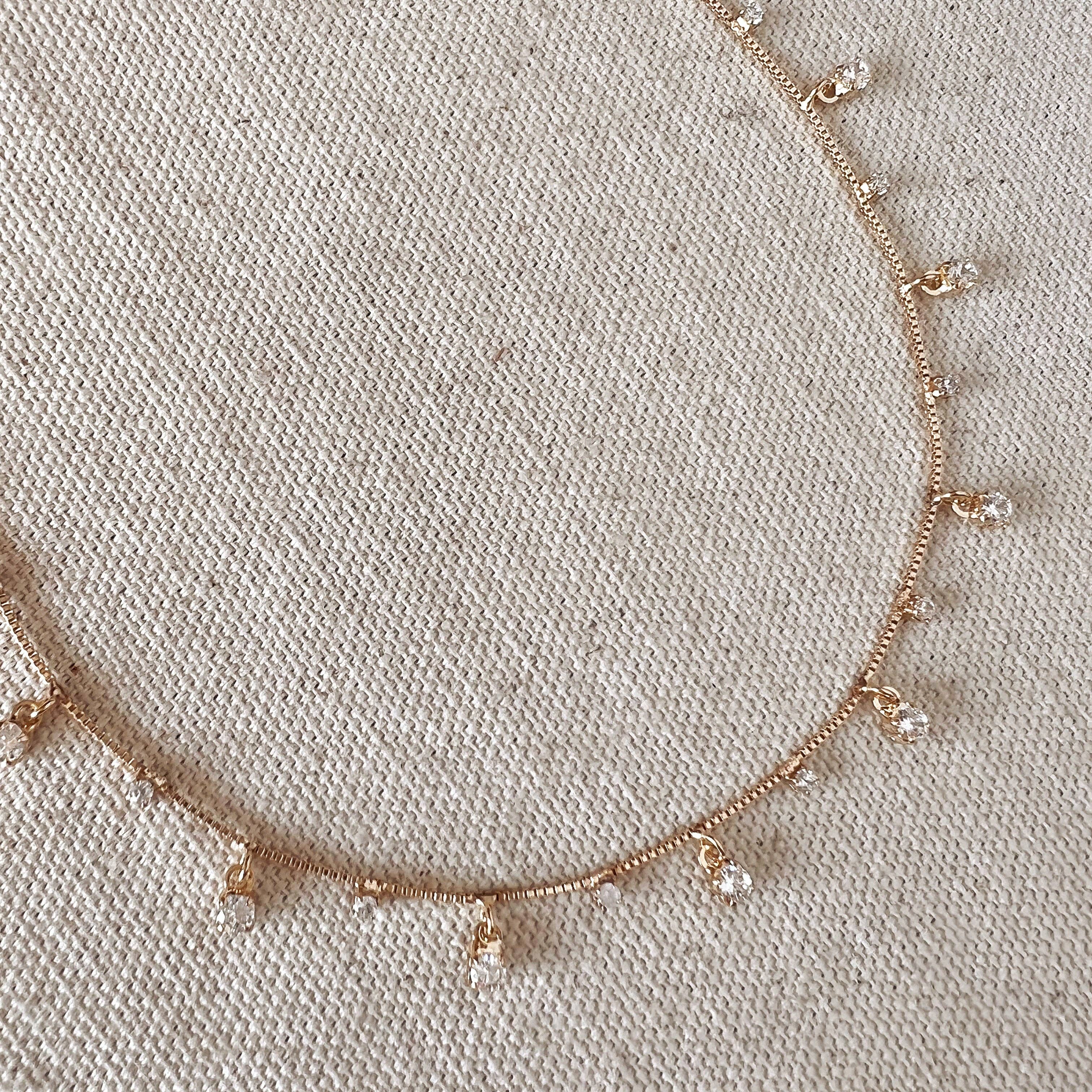 This delicate 18k gold-filled necklace with alternating fixed and dangling cubic zirconia stones is feminine and adds a touch of sparkle to any outfit.