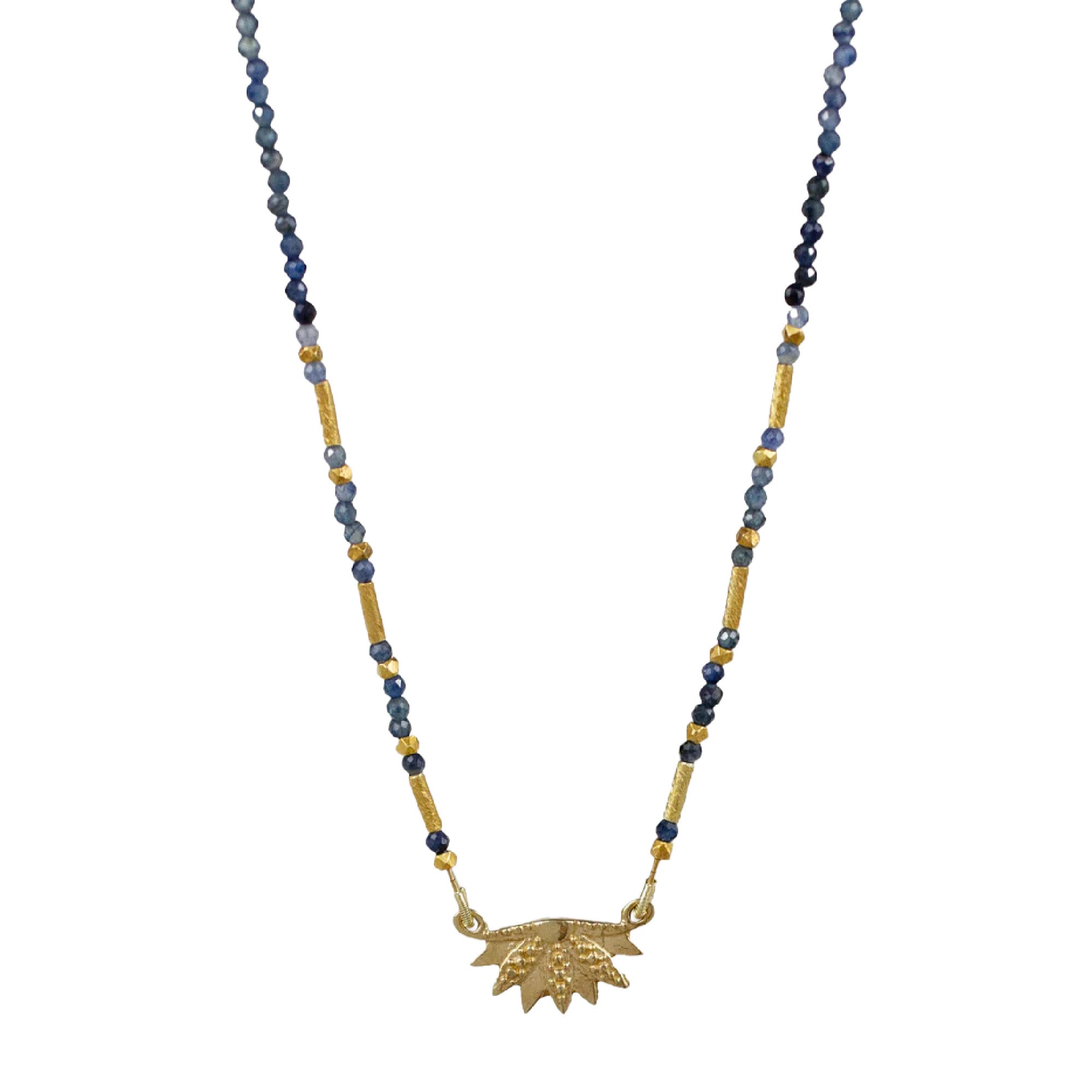Inspired by the lotus flower's ability to persevere and grow, the Bloom beaded necklace features a bronze half-lotus charm centered on a strand of micro-faceted gemstone beads, blending mysticism and beauty in a stylish design.