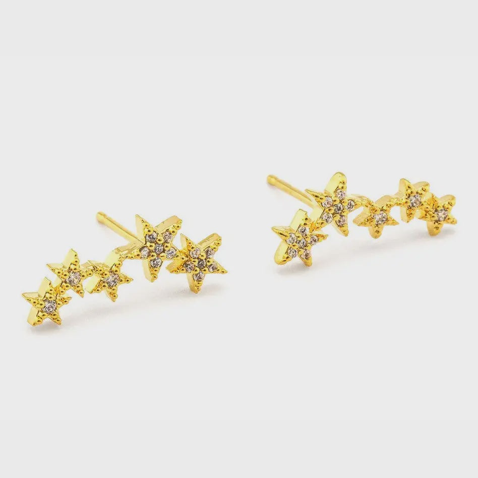 The pave 5 star earrings are a celestial touch to your outfit. Five shimmering stars wrap around your earlobe, making for a bright detail with lots of shimmer. Hancrafted in gold-plated brass, they have an artisan and playful look.