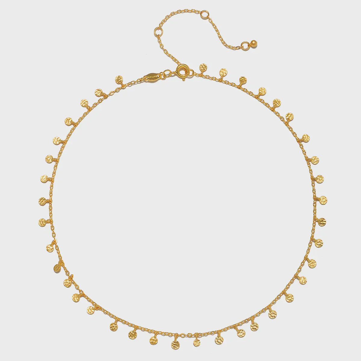 This 18K gold-plated choker necklace flutters with hammered golden discs that catch and scatter light like stars that shimmer in the night sky.