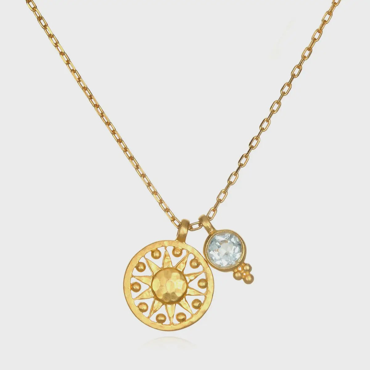 A glimmering blue topaz improves communication, imparts wisdom and ignites love in its wearer, while the sun symbolizes vitality, leadership and life. Wear this blue topaz sun pendant necklace to remind you that peace, love and understanding are always within reach.
