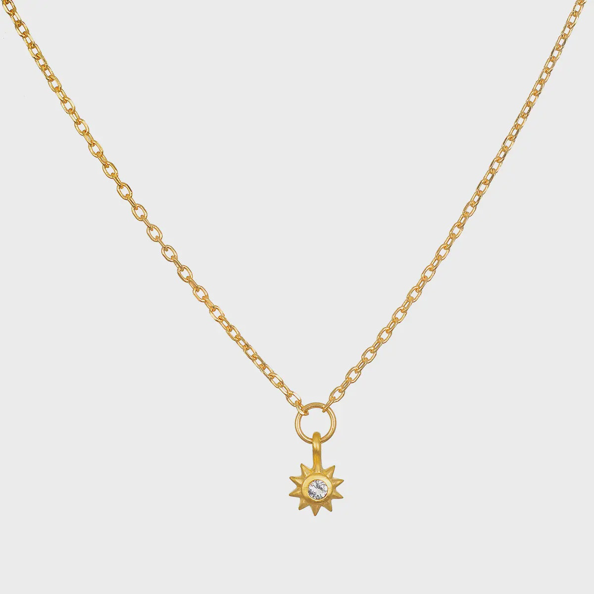 Wear this 18K-gold-plated mini sun pendant necklace to channel the sun's energy as you take on any challenge the day brings. In many cultures, the sun represents vitality, leadership and life. The lucent spirit mini sun pendant necklace has a white topaz stone at its core—a symbol of individuality, creativity and awareness.