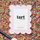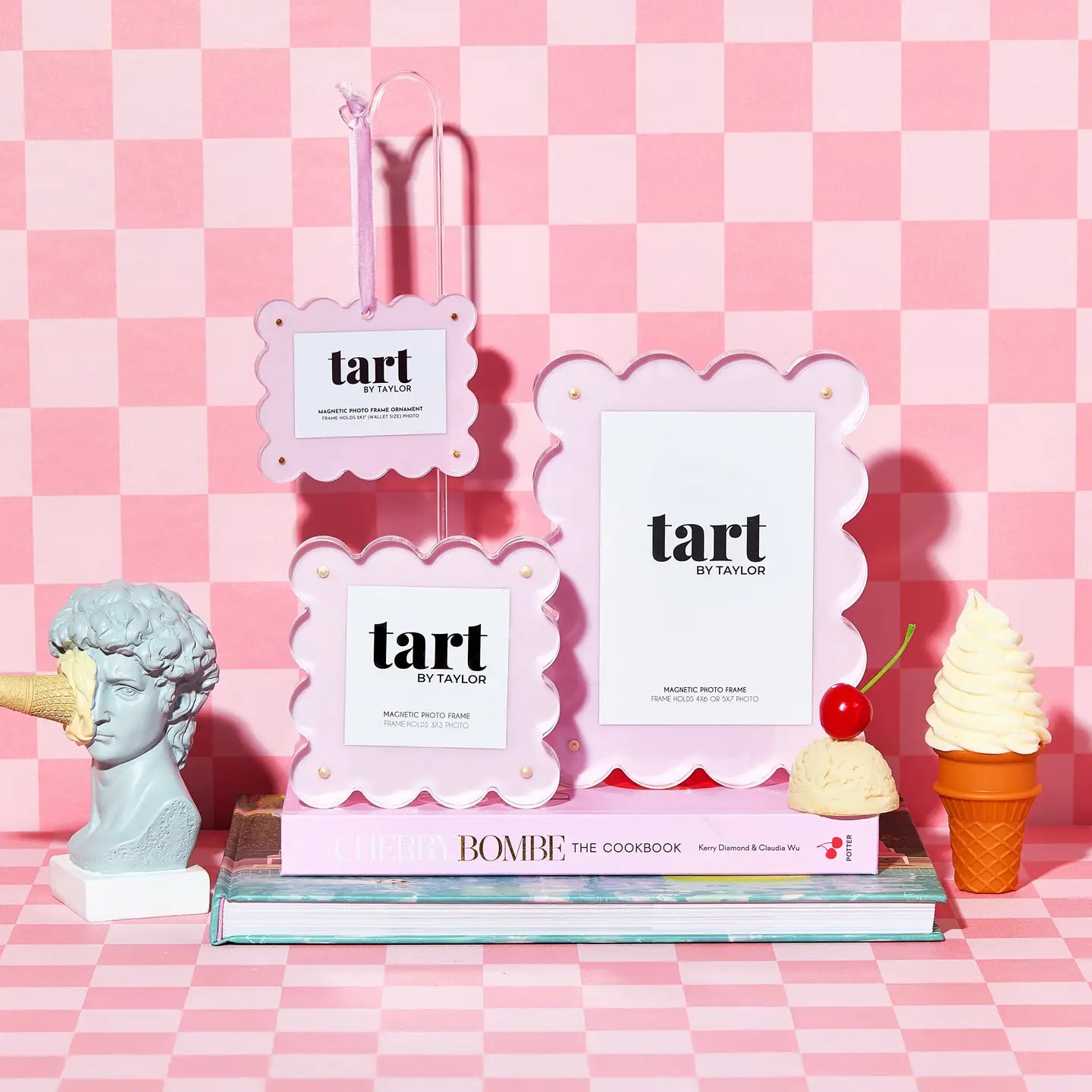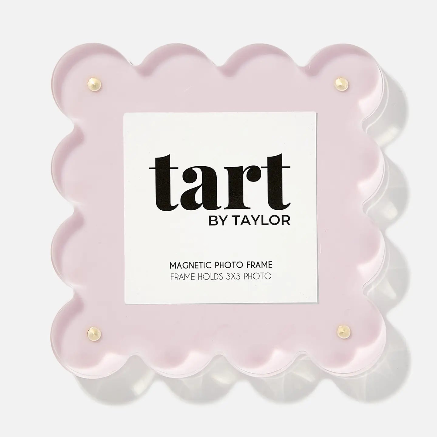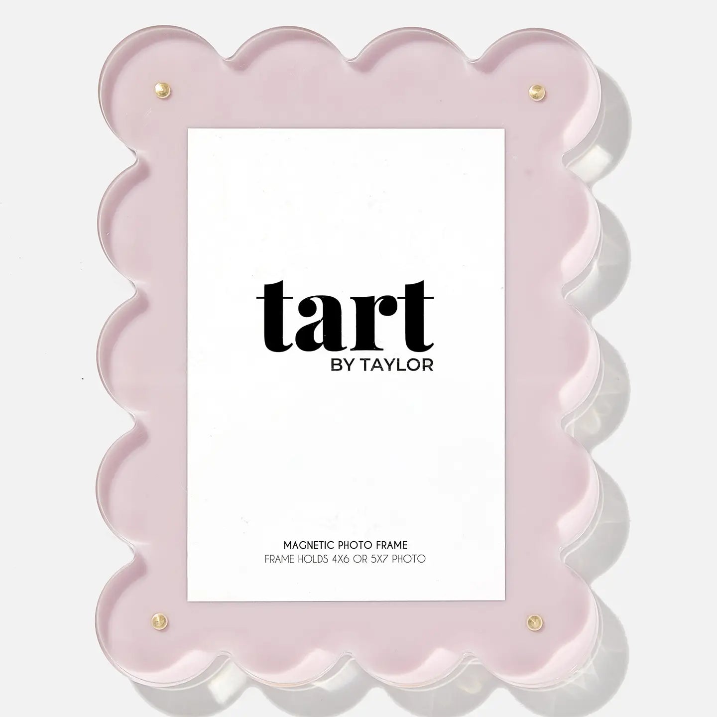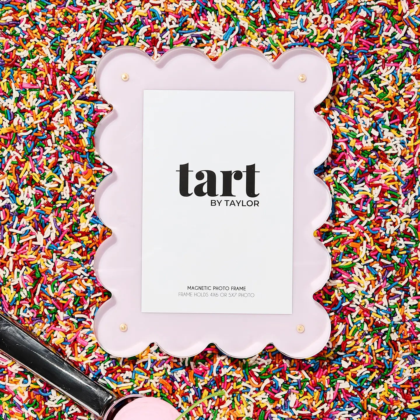 This lavender acrylic scalloped frame has small magnets in the corners to neatly store favorite photos, tickets, dried flowers or invitations in a place of prominence. This Tart by Taylor frame can stand vertically or horizontally.