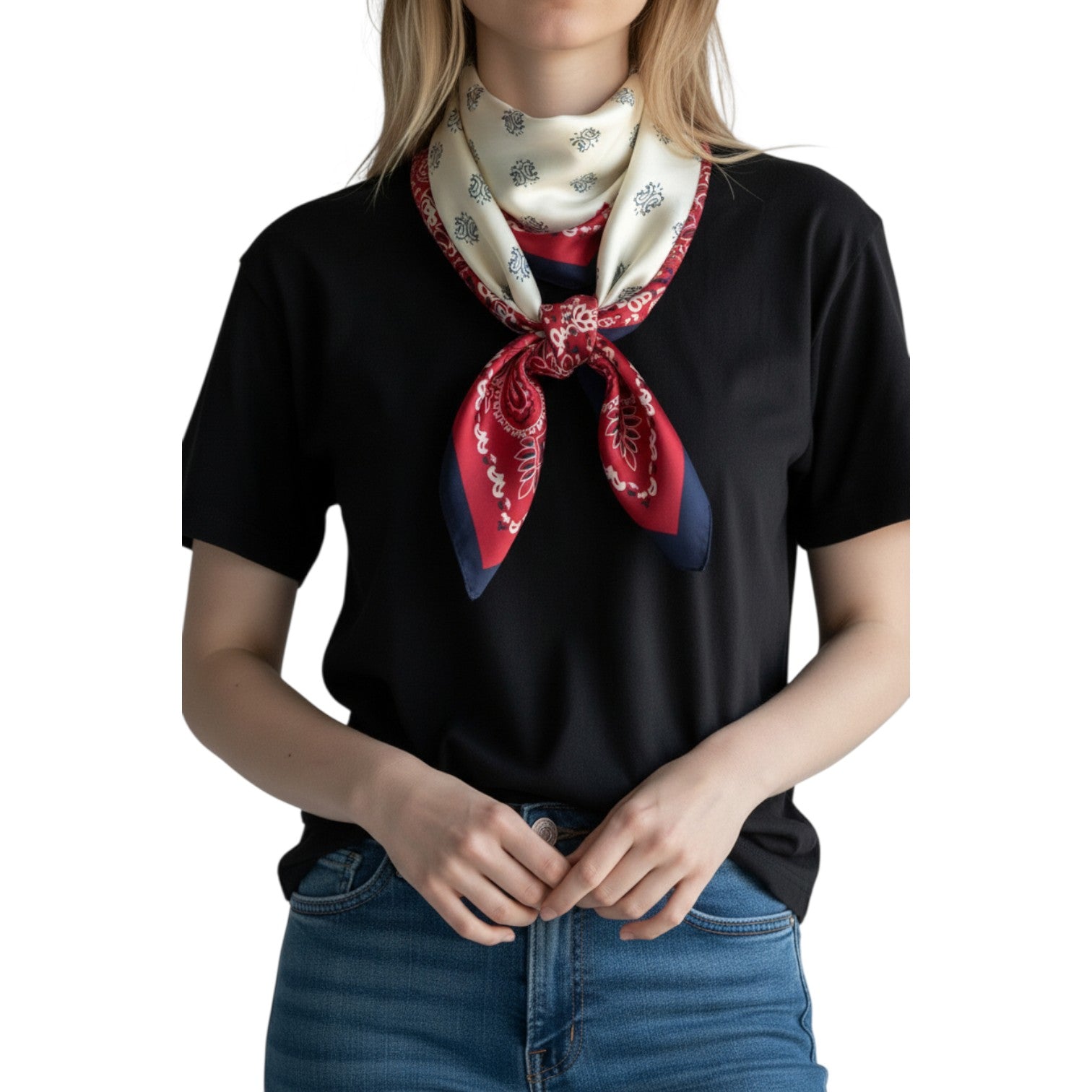 This silk-feel paisley scarf brings a refined twist to a classic motif. Featuring a timeless bandana pattern in a perfectly sized square, it’s designed for effortless, everyday styling, tied at the neck, wrapped on a handbag, or worn as a chic hair accessory.