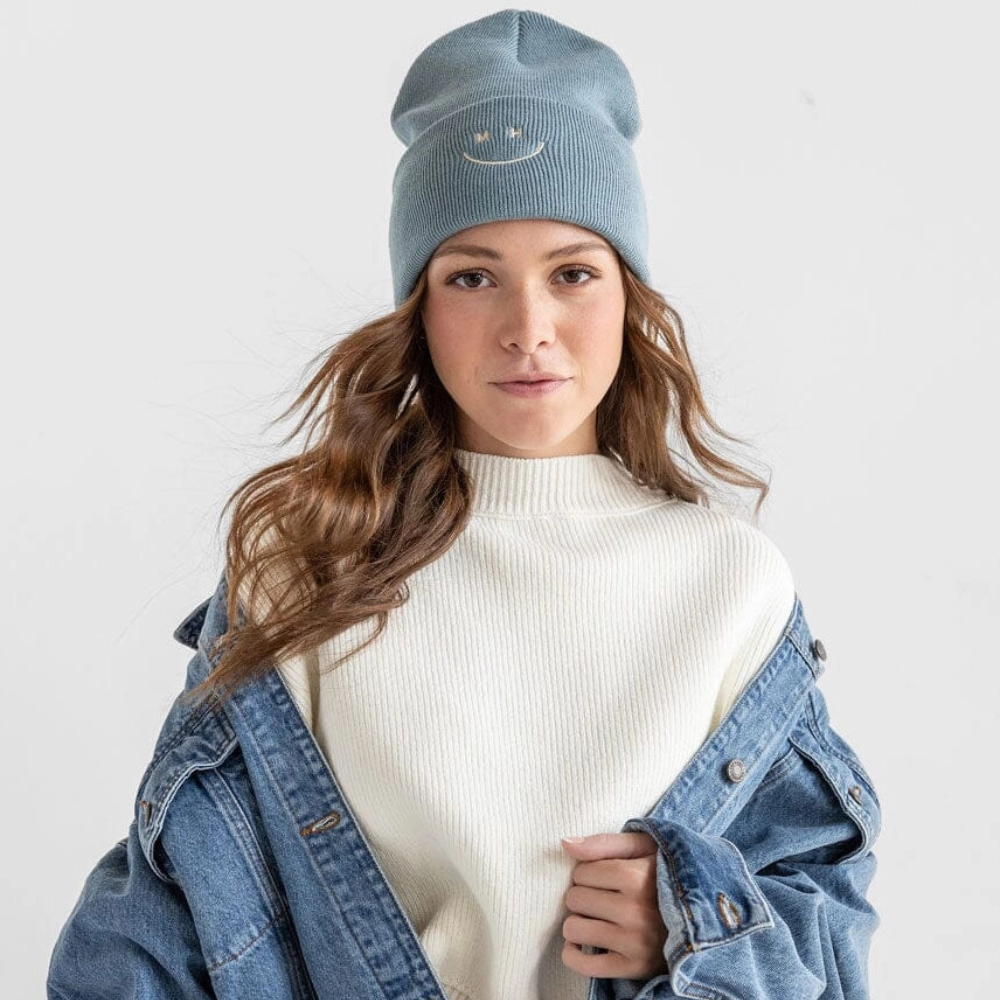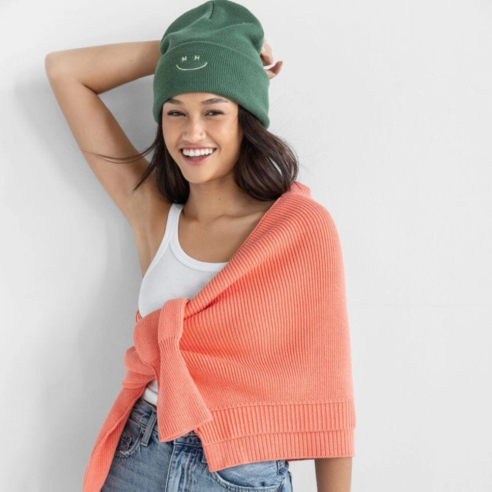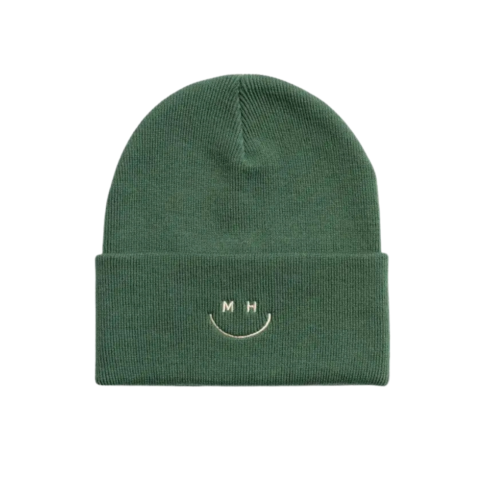 The Mad Hatter knit cuff beanie is the quintessential cold weather classic, featuring thick, acrylic yarn, a longer profile and a wide rollover adjustable cuff. Soft to the touch, the stretchy rib knit creates a stay-put fit. The fold up cuff has an embroidered smiley MH logo.