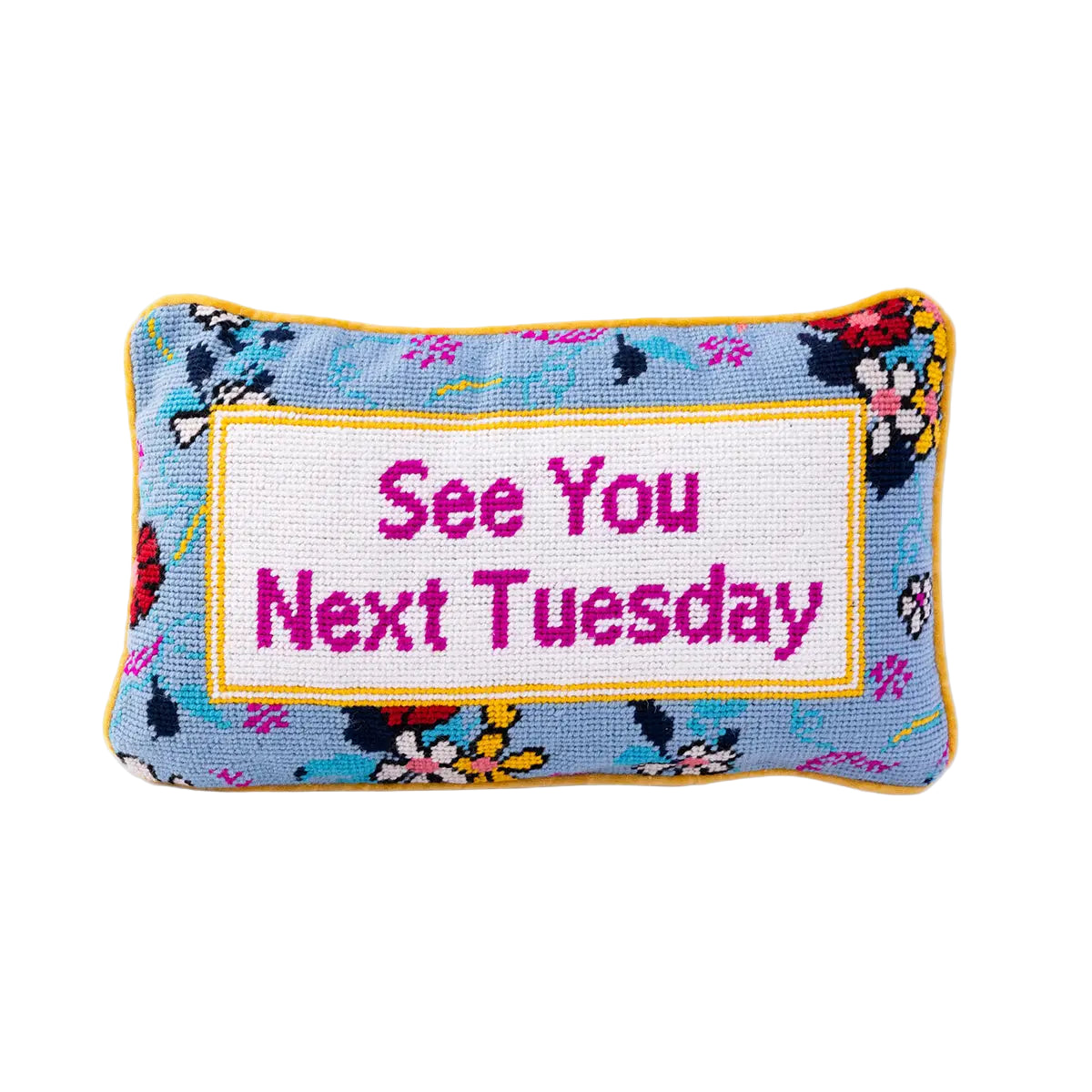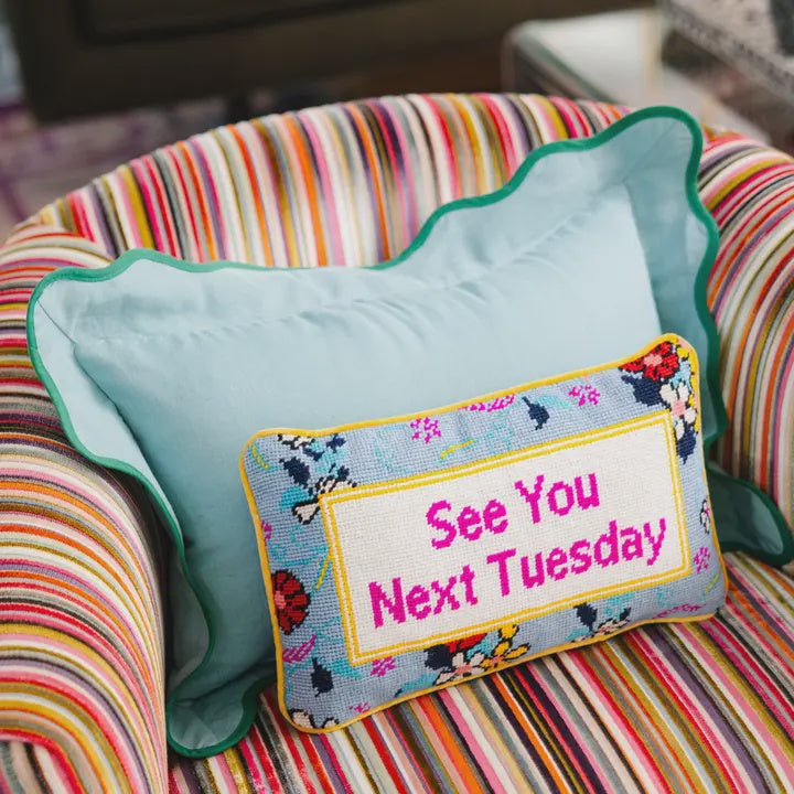 Sometimes subtlety isn't necessary. This "See you next Tuesday" pillow from Furbish Studio cuts to to the chase and lets guests know you'd like to be left alone this weekend. It's part of Furbish's joyful collection of needlepoint statement pillows that embrace the southern traditional craft with a modern sensibility. The playful prints, sassy sayings and vibrant colors of this collection are sure to spark happiness and a few laughs.