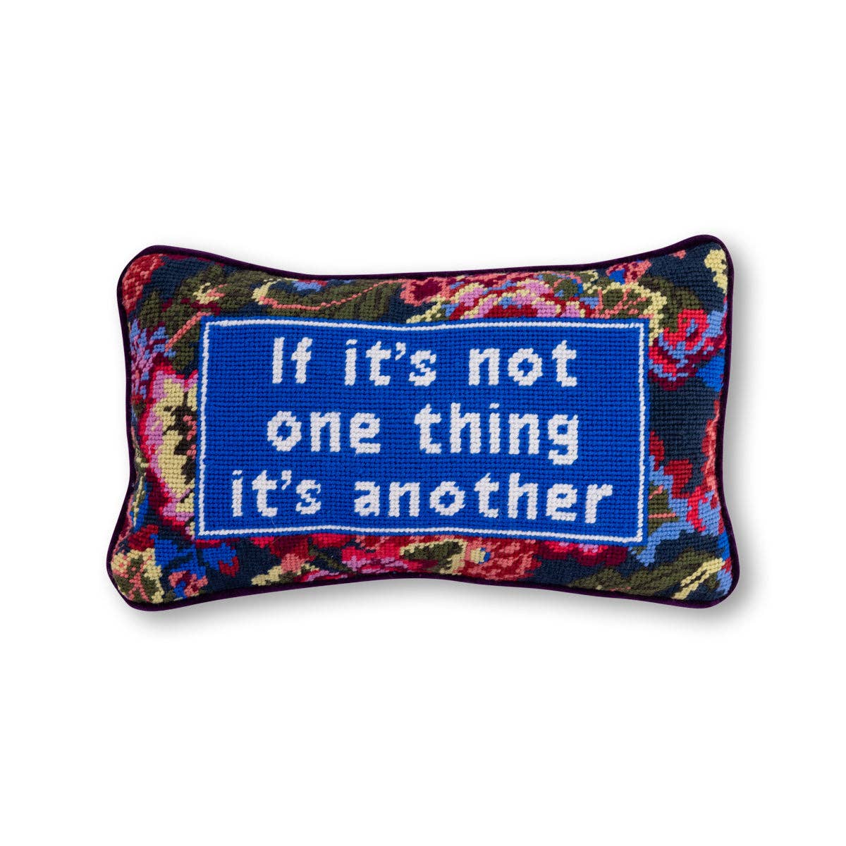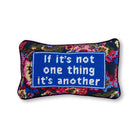 This pillow is for those who say, ‘If it’s not one thing, it’s another,’ because sometimes, it feels like the universe just can't let you catch a break—but you still roll with it. Make a statement with this charming-meets-chic needlepoint pillow. Embroidered and backed in luxe dark purple velvet, we've revived this Southern staple with sayings that are sure to get a smile. They are guaranteed to spark joy and make the perfect gift! Dare to mix with Furbish scalloped linen, contrast trim velvet, ruffled block print, and needlepoint pillows for an insta-worthy pillow pile.