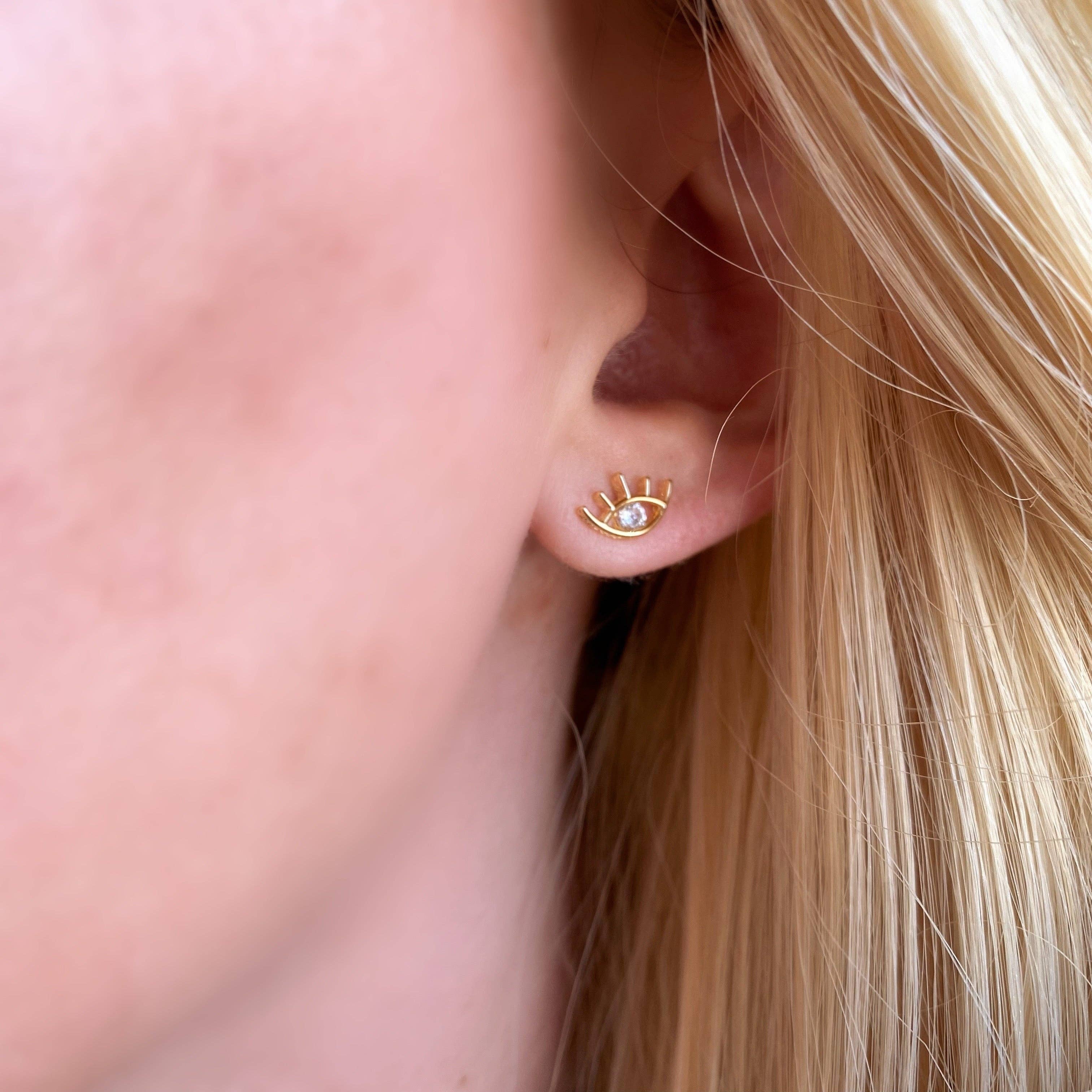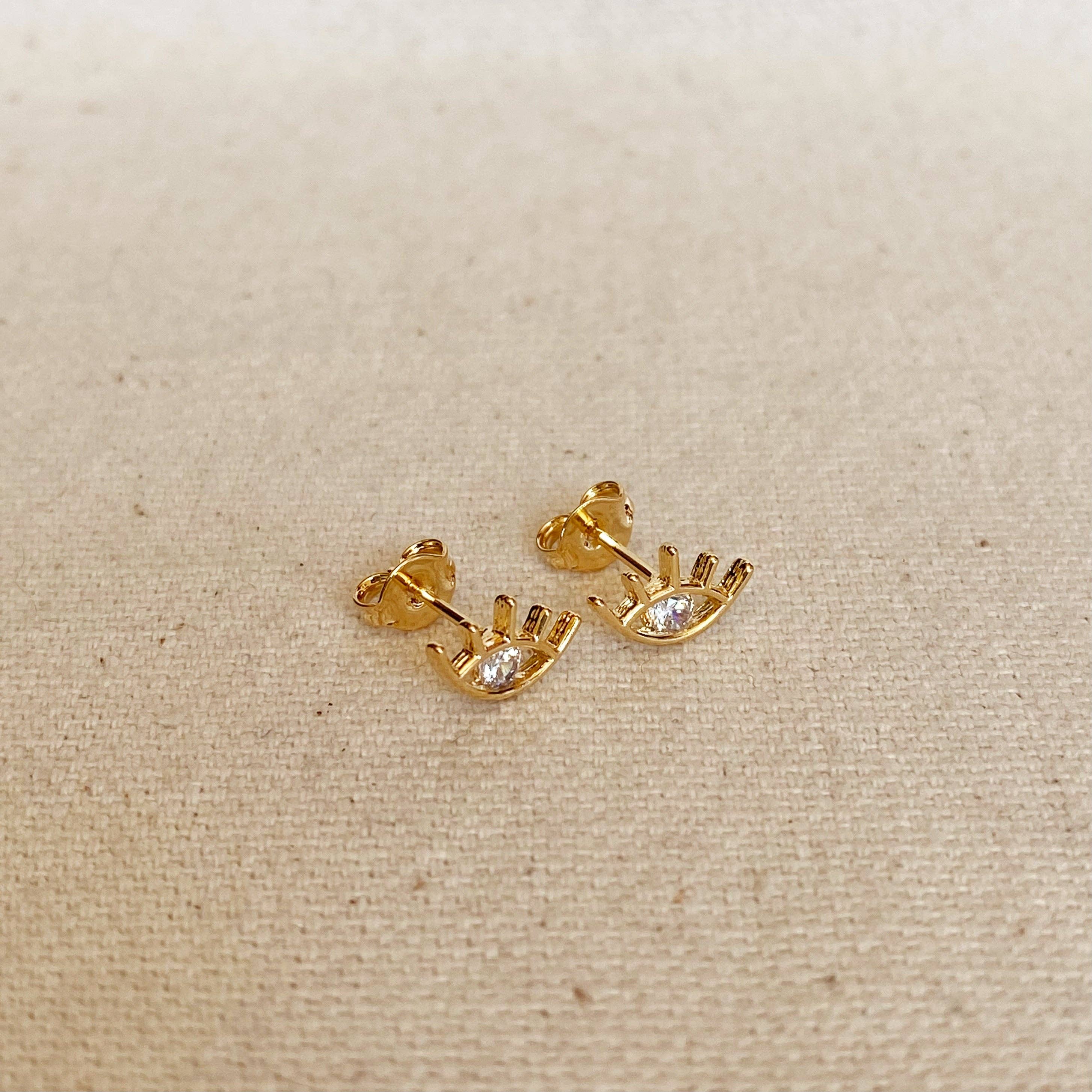 The tradition of eye graphics dates back to ancient civilizations as a symbol of enlightenment and the presence of a higher power. This whimsical and delicate eye stud earring is 18k gold filled with a cubic zirconia stone at its center.