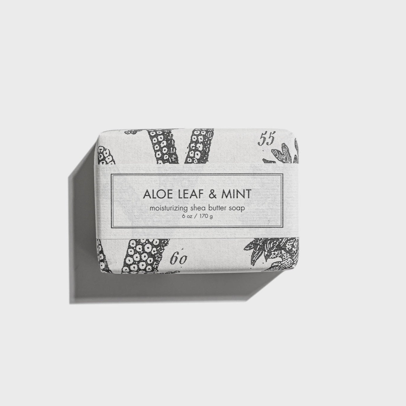 This shea butter soap with aloe leaf and mint has a touch of black pepper. An invigorating morning pick-me-up, its a clean and refreshing scent.