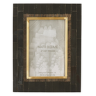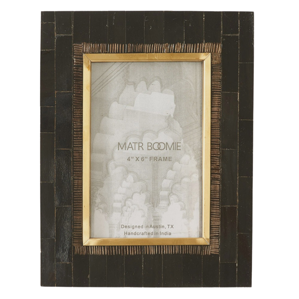 The Andhera 4 x 6 Black Picture Frame features hand-carved black horn with a brass inner frame inlay, in a gold tone finish. The sleek dark combination of black and gold is reminiscent of art deco with a modern minimalist twist. This gender neutral color combination would make a great gift for him or her, suit a variety of interior spaces and make a versatile gift for special occasions where memories are created, such as birthdays, housewarmings and anniversaries. The frame features a two-way easel back, metal swivel tabs to access opening, glass cover and a metal d-ring for hanging vertically.