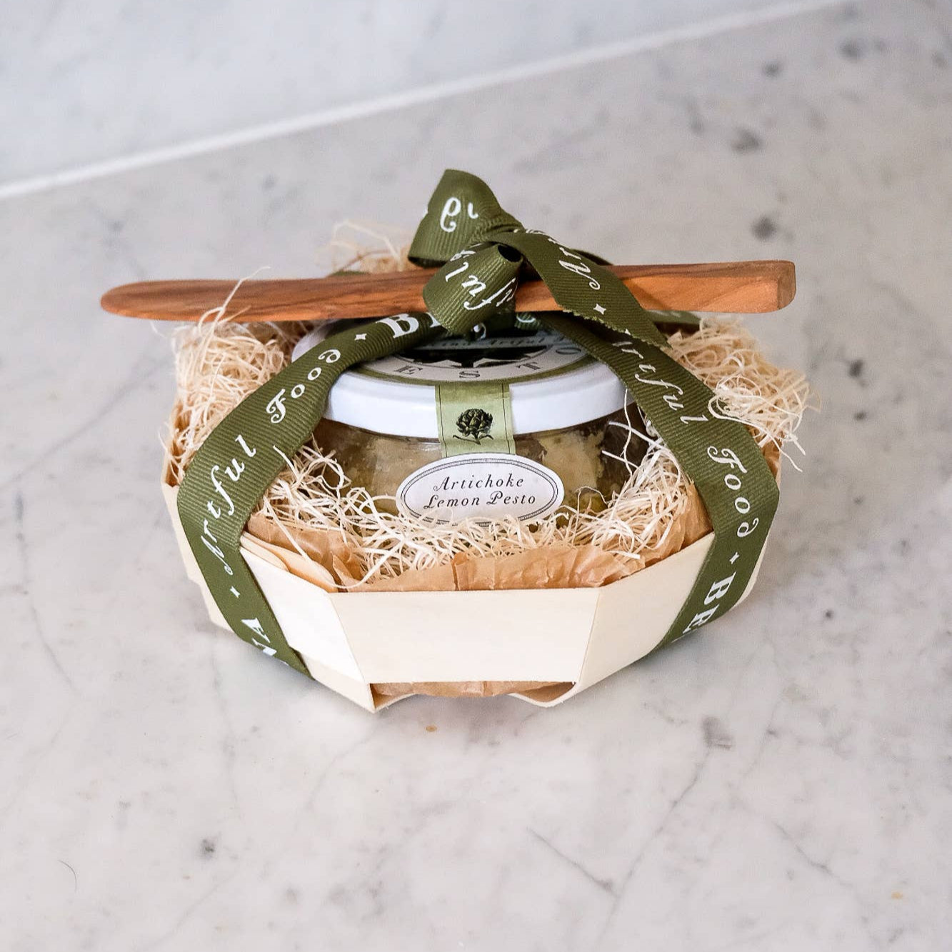 Tied with ribbon, nestled in excelsior, this savory hostess gift of artichoke lemon pesto from Bella Cucina goes great with rustic flatbread. The olivewood spreader is a thoughtful touch the recipient will enjoy long after the pesto is finished.