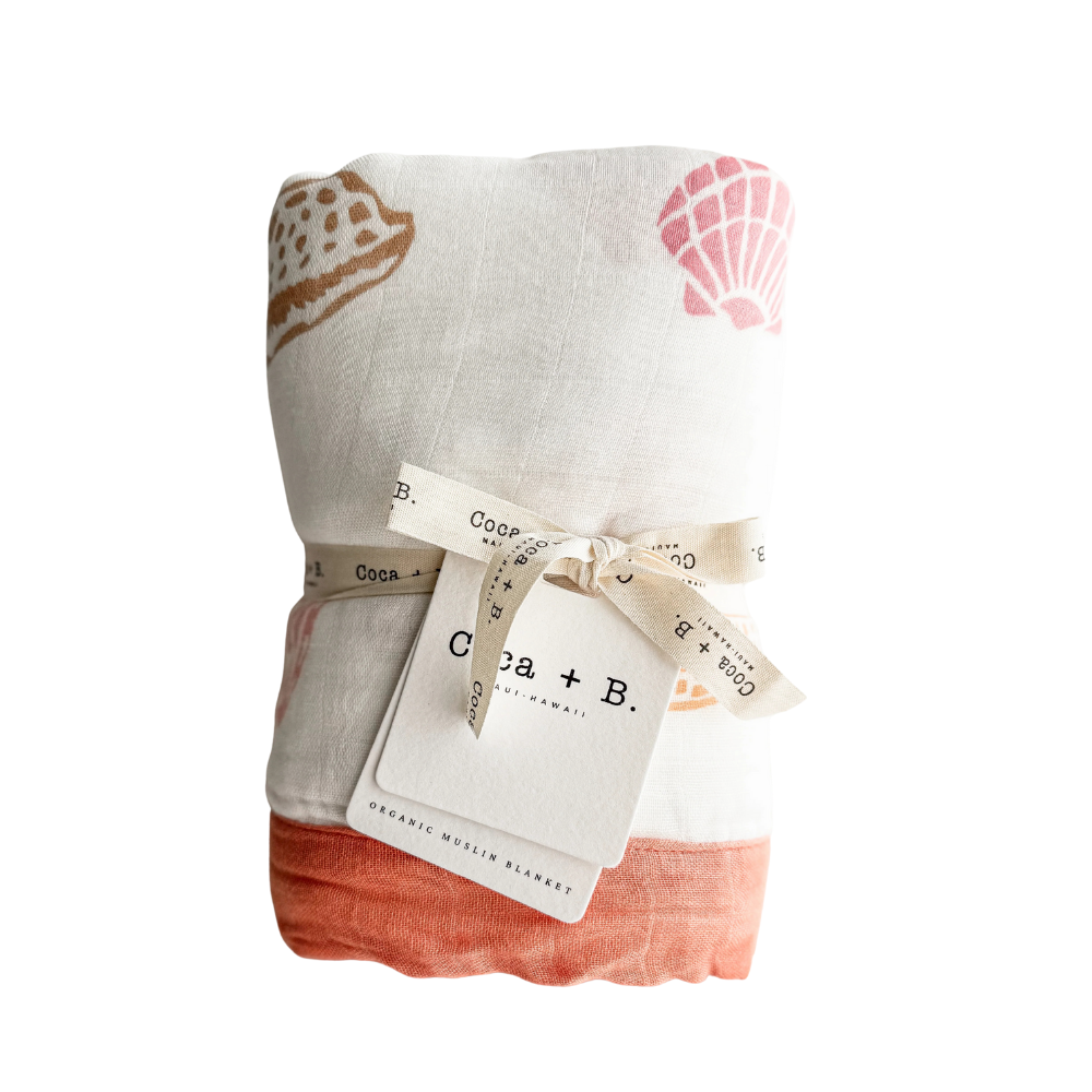 The seashell print muslin baby blanket exudes the buttery softness bamboo is known for. Not only incredibly cozy, breathable, midweight and moisture-wicking but also sustainable, the blend of organic bamboo and cotton fabric has just a little extra weight, perfect for cooler environments. Each blanket is beautifully packaged in eco-friendly organic cotton ribbon with deluxe cardstock and ready to gift. With soft earth tones of terracotta, peach, mauve and beige, it was designed to capture the essence of the perfect coastal lifestyle.