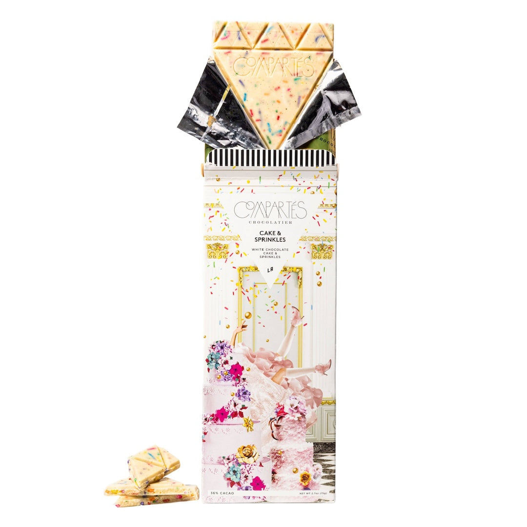 Compartés chocolatier birthday cake and sprinkles gourmet white chocolate bar is a festive and luxurious treat made with three types of vanilla beans, moist white birthday cake mix and lots of sprinkles. It's handmade in the company's Los Angeles kitchens.