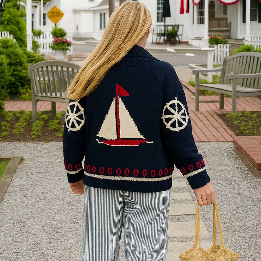 The Sailboat Cardigan is the perfect piece for breezy days by the sea or chilly winter evenings. With its classic sailboat motif and timeless varsity duffle cardigan design, it’s a cozy layer you’ll find hard to take off. Soft, comfortable, and effortlessly charming, it brings a touch of nautical nostalgia to any season.