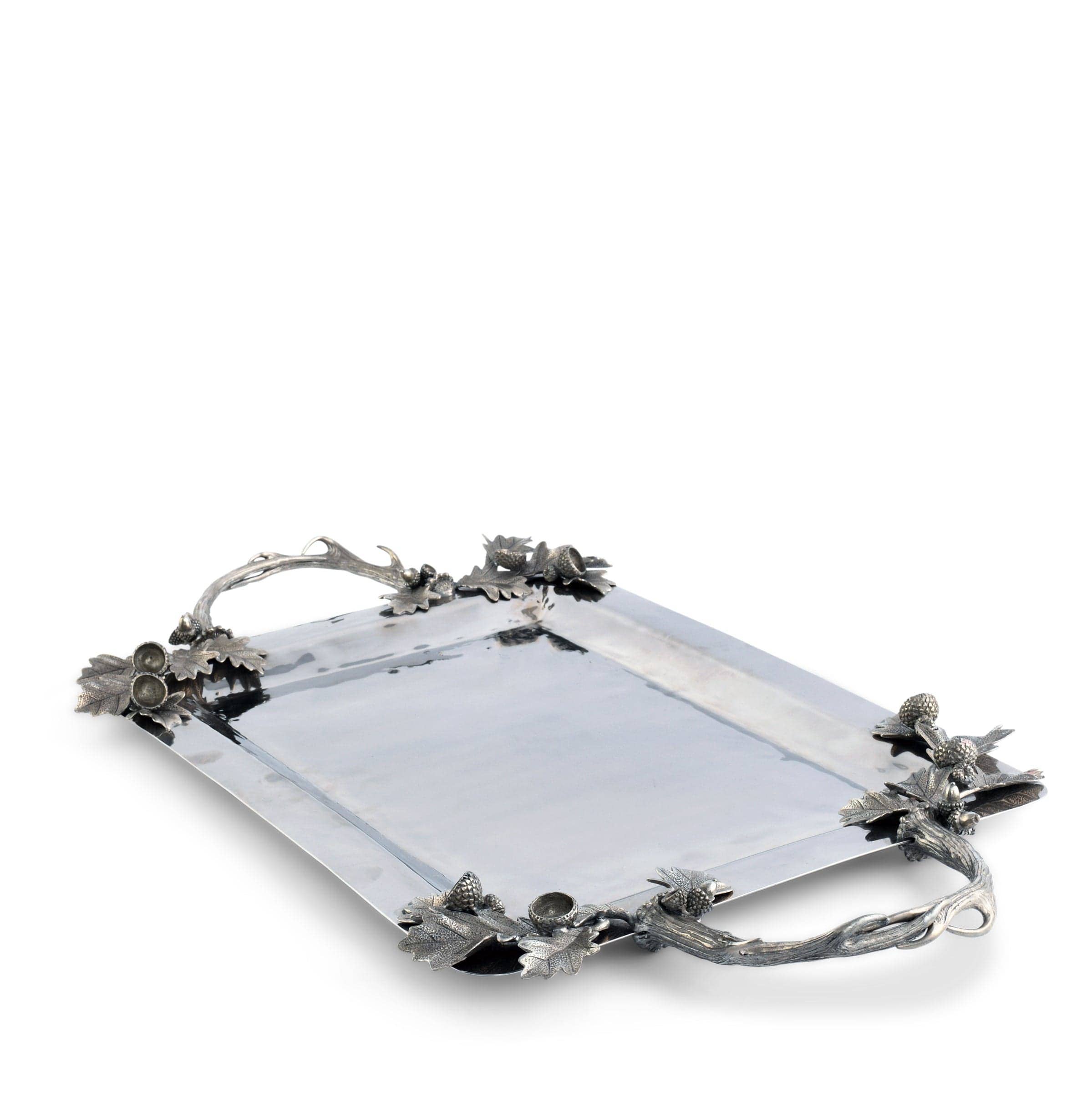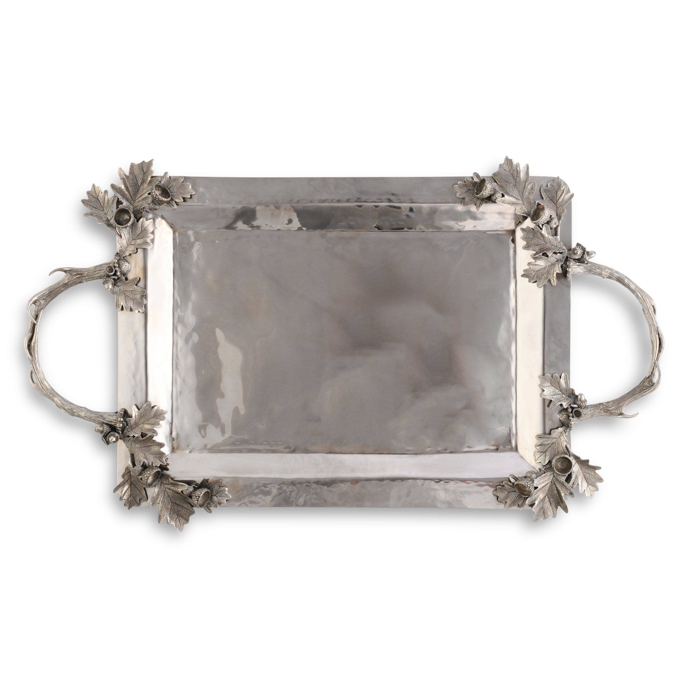 Add a touch of rustic charm to your home décor with this fallen antler stainless serving tray from Vagabond House. This beautifully designed tray features striking antler-pattern handles and clusters of acorns and leaves on a high-quality stainless steel surface. With its generous size, this tray is perfect for serving drinks, appetizers or desserts. The durable stainless steel material ensures that this tray will last for years to come.